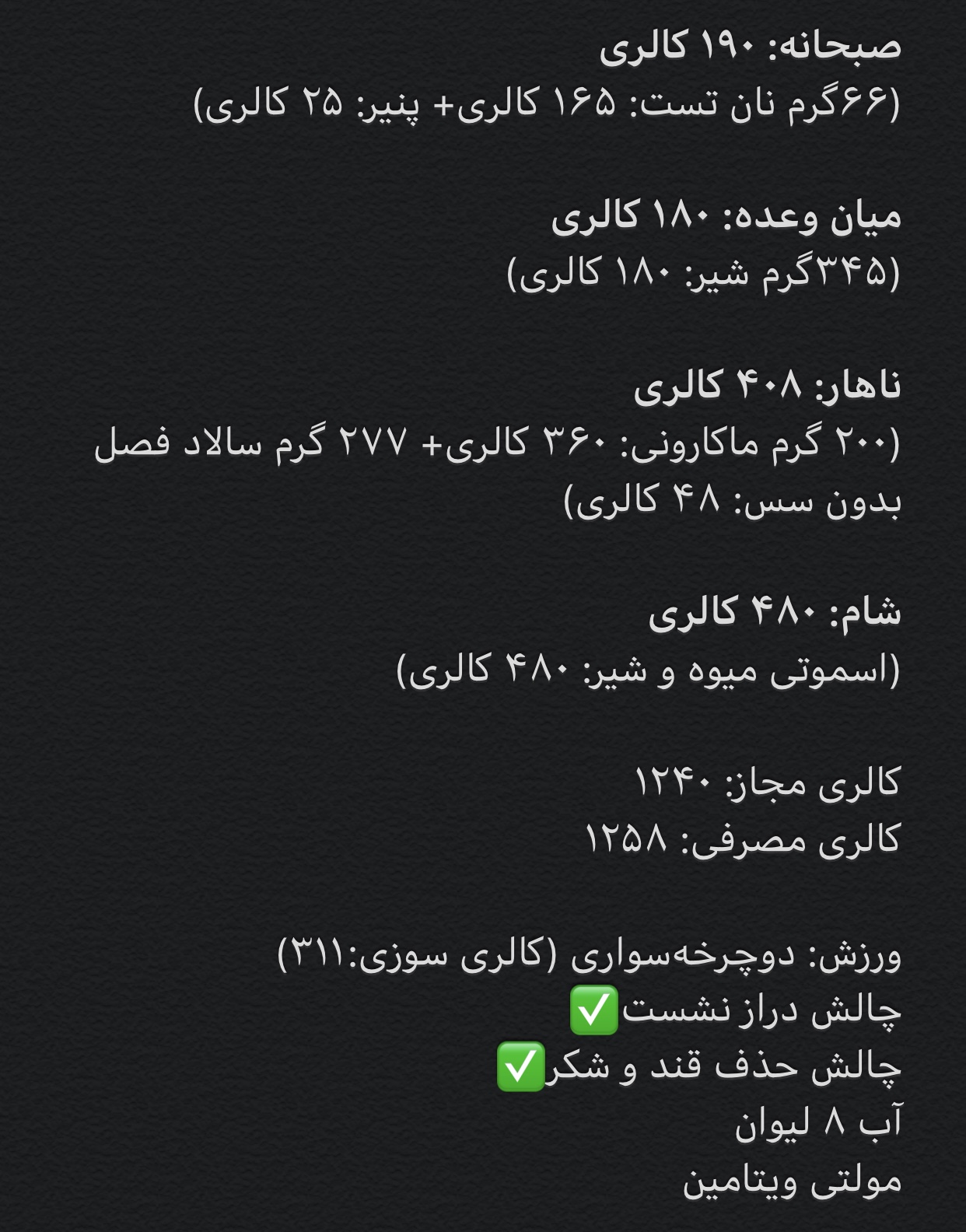 ✔ورزش : پیاده روی آروم یه ربع + هوازی و رقص بیست دقیقه + اپلیکیشن ۳۰ دقیقه