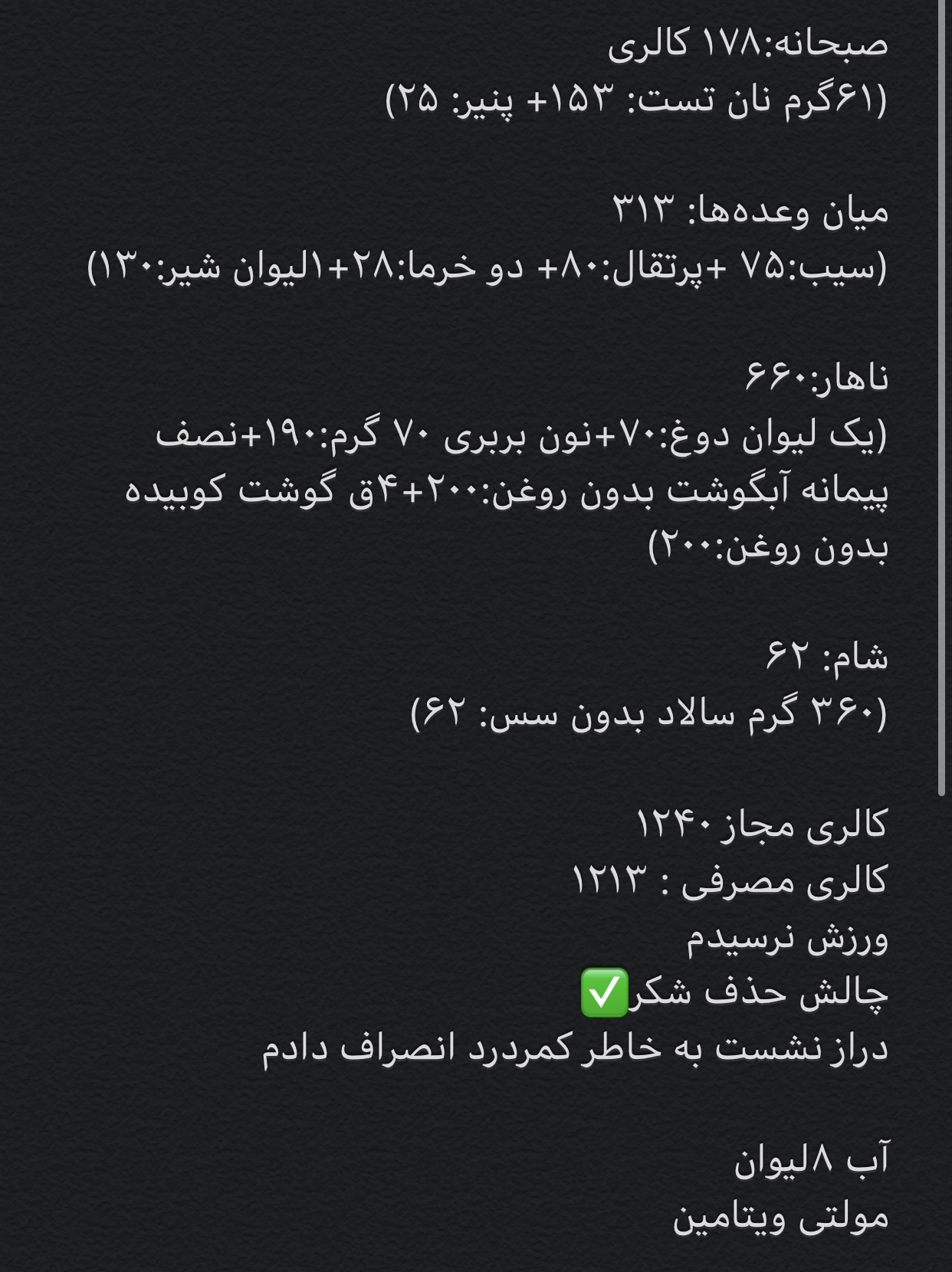 مصرفی. ۱۶۰۰(بخاطر نبود ورزش خودم از کالری کمی کم کردم)