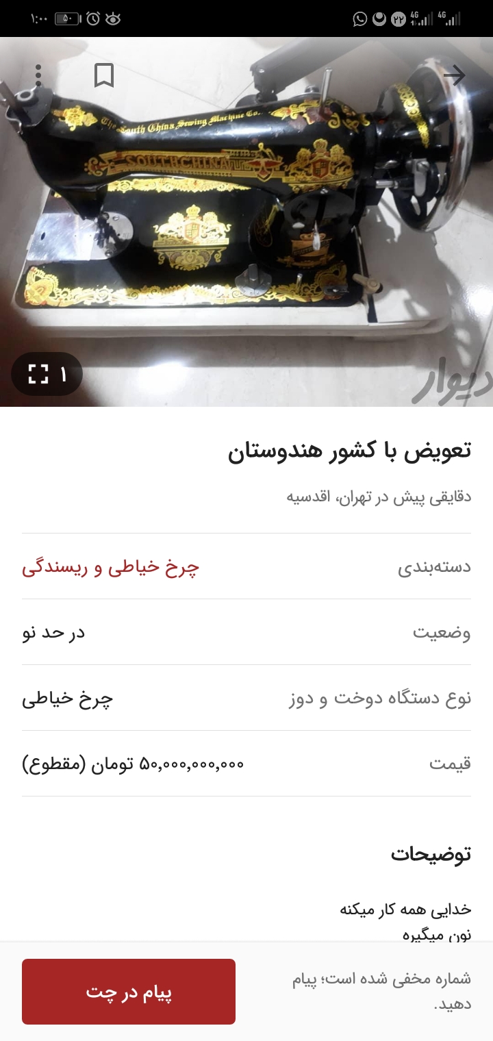 shima_80 مدیر استارتر عضویت: 1400/04/29 تعداد پست: 2360 قضیه این چرخ خیاطی قدیمیا چیه؟شایعه یا واقعیت؟ جدی اگهی خودم پیام دادم 🤣🤣