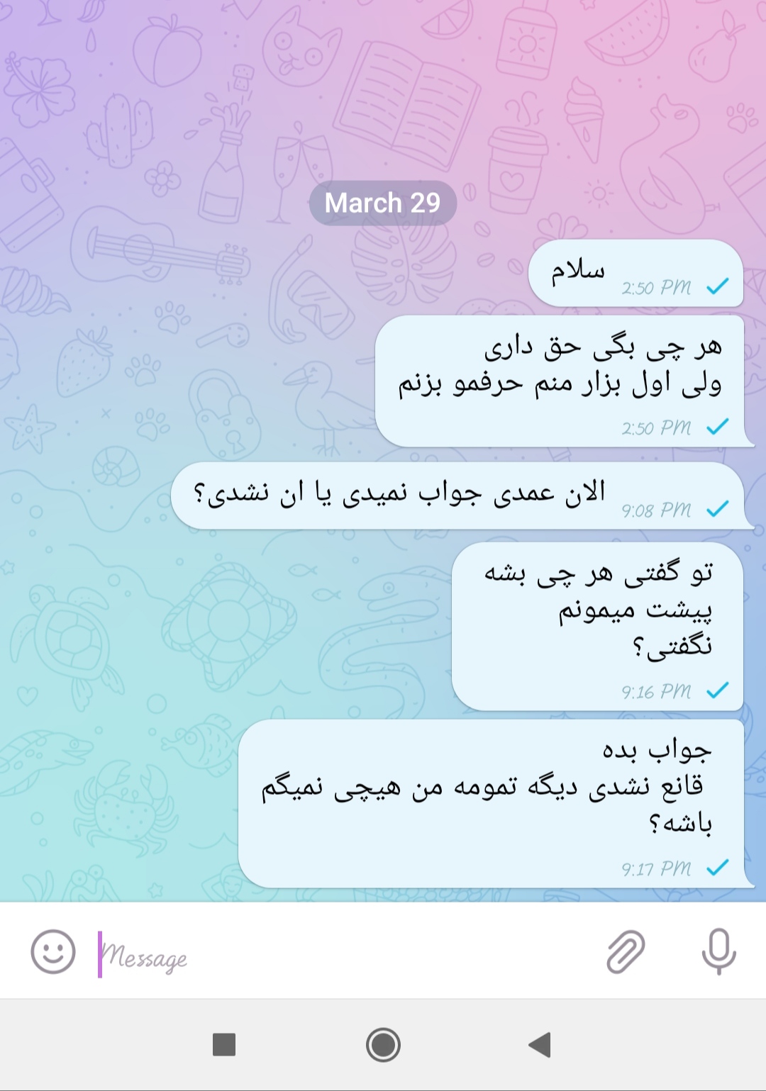 صبح از بلاکی دراوردمش بهش پی دادم نه سین زده تا الان نه جواب داده  الان چطور از دلش درارم واقع ...