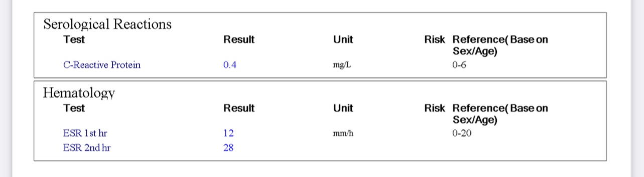 مشکلی نیست فقط یکم ESRدو ساعتت بالا هس اونم شاید التهاب یا عفونت تو بدنت داری