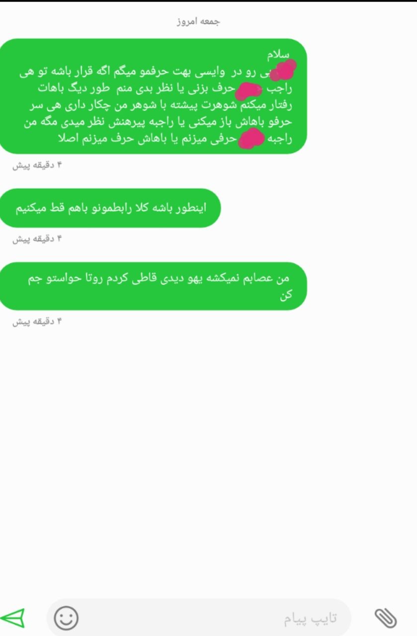 امشب با دوسته شوهرم و زنش بیرون بودیم زنش به من می‌گفت پیرهن مشکی به شوهرت میاد منم برگشتم گفتم به ت چه بعد داشتیم بازی میکردیم هعی اسمه شوهر منو صدا میزد من توپیدم بهش گفتم هی اسم شوهر منو صدا نزنا پامیشم میزنم لهت میکنم قبلانم میرفتیم خونشون خیلی سبک بازی در میاورد اومدم خونه الان بهش پیام دادم ببینید خوب گفتم بهش؟