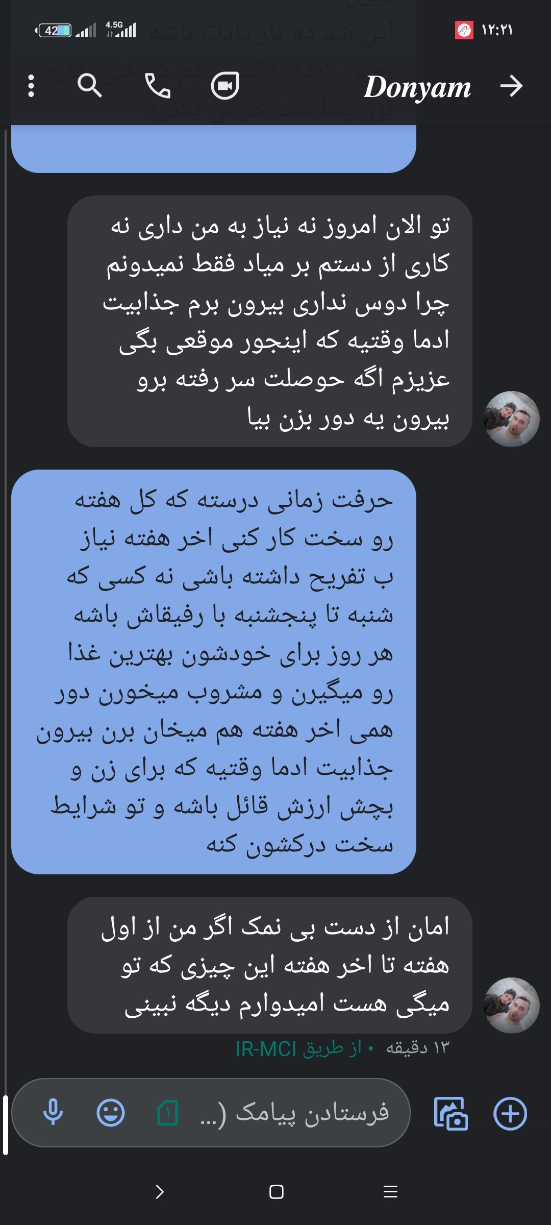 صبح همون شریکش و چنتا از رفیقاش زنگ زدن اماده شد بره گفتم امروز جمعه هست چرا میخای بری بیرون بمون پیش ما