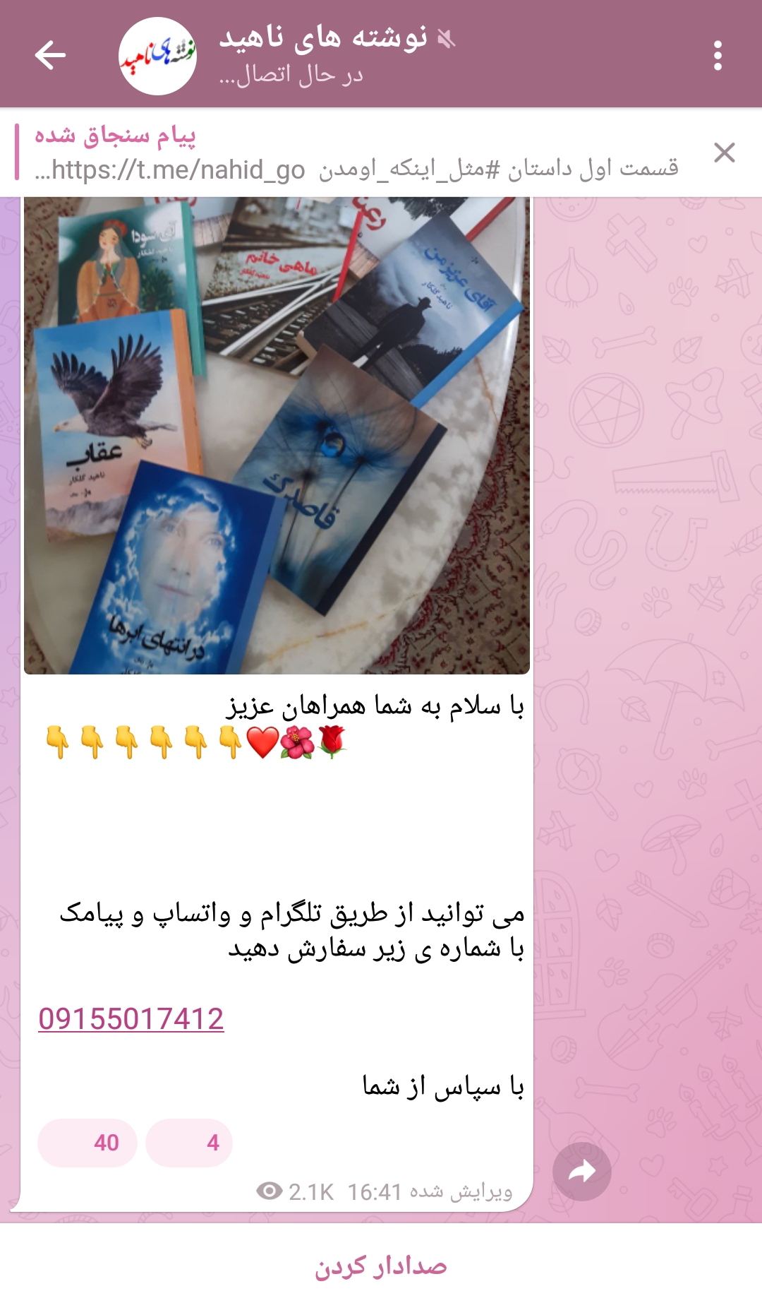 گوهرشبچراغم مدیر استارتر عضویت: 1402/06/28 تعداد پست: 1811 https://t.me/nahid_golkargolkar داستاناش عالیه و اکثراً واقعیت نمیشه برم داخلش 😣چرا؟