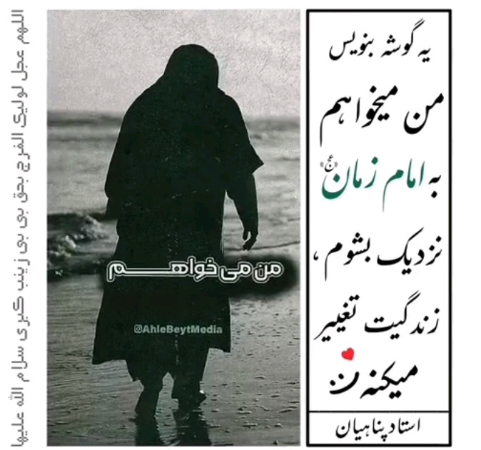 💍❤تلنگر اول :1401.6.4 (خیلی عمیق) یکسال در حال خوبی گذروندم و خیلی چیز ها رو دیدم که روحم رو از دنیا جدا کرد و منو به اوج بندگی و یاوری امام زمان عج رسوند...  مدتی بمقداری دور شدم که مقصر خودم بودم💔 و امروز (1402.10.20) عهد بندگی و یاوری مجدد بستم... هر جا برم و در حالی باشم در نهایت در آغوش آقا جانم تاج سرم عشق دنیا و آخرتم، امام زمان عج آروم میگیرم🥺 اللهم عجل الولیک الفرج😍❤️ آقا جانم عاشق لحظه ای هستم که بیاین و ما با پاک کردن اشکامون نظاره گر رخ زیبای شما باشیم🥺😍 عزیزجانم.. هر وقت نیاز به دعا داشتی من به دیده منت قبول میکنم (سوره های قرآنی، نذر و صلوات)... تبادل نظرهای خادم_المهدی_۳۱۳ 🌿سر‌شد‌به‌شوق‌وصل‌تـو‌فصل‌جوانیـَم هـرگز‌نمیشود‌ڪه‌ازاین‌در‌برانیـَم🥺😍❤️