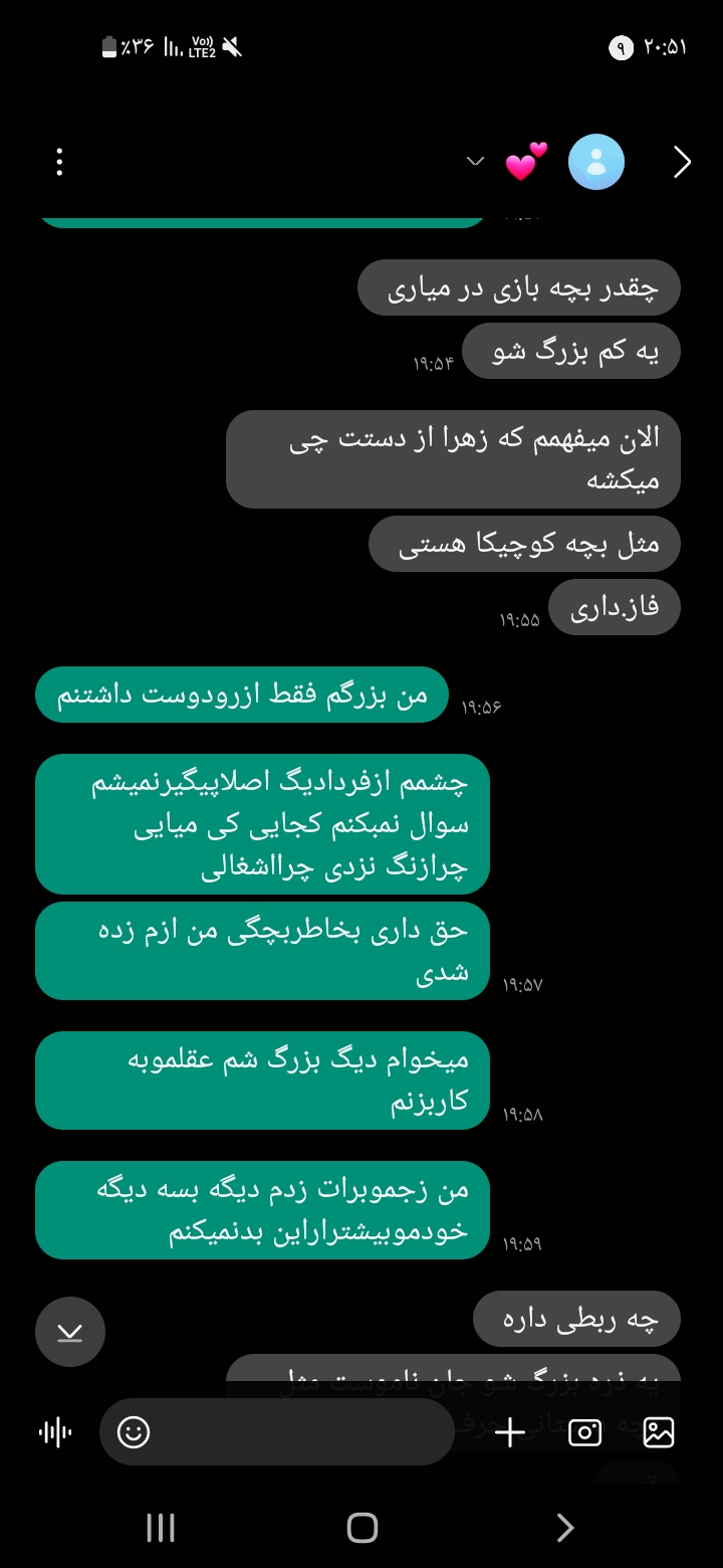 یادت باشه تو این دنیا هیچ چیزی از هیچ کسی بعید نیست... اگر مادر شدی یادت نره اول تو باید شاد و قوی باشی تا بتونی شاد بزرگش کنی یک بچه از همون روز تولدش نگاهش به خنده های مادرشه نه رنگی بودن اتاقش... شوهر خدا نیست نون شبت گرو اون نیست پس از سر ناچاری کنارش نمون اگر حرمت گزار نیست .