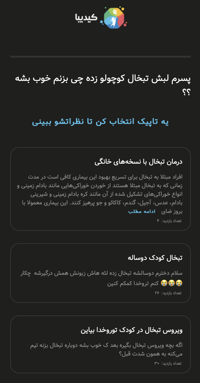 95maman_fateme عضویت: 1402/03/13 تعداد پست: 623 جواب کاربرای باتجربه نی نی سایت در این مورد رو میتونی با کلیک روی لینک زیر ببینی. من سوالت رو اونجا نوشتم.https://kidiba.ir/content/oz87temcqo تو سایت Balenj.com میتونین سوالتون رو بپرسین و جواب کاربرهای باتجربه نی نی سایت رو ببینین.