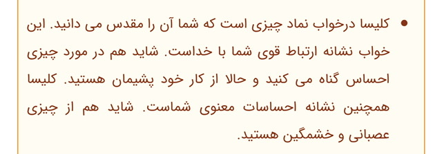 من تو واقعیت خیلی کلیسا دوس دارم و بعضی وقتا میرم با دوستام .. بچه ها خواب دیدم با یکی از اشناها وارد کلیسا شدیم که هیچکسی جز منو اون نبود تقریبا متروکه بود و شبیه هیچکدوم از کلیساهایی ک رفتم نبود