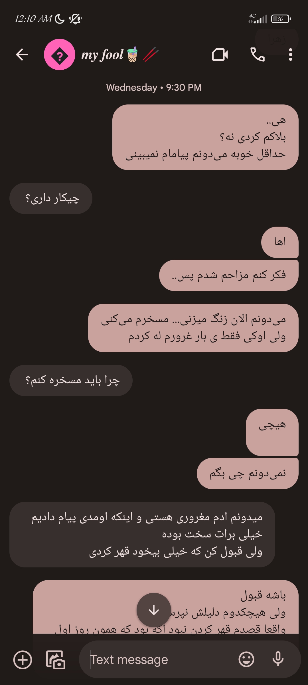 بهش دیشب پیام دادم ولی خیلی بد برخورد کرد و واقعا ناراحت شدم میدونستم زنگ زده به اون یکی دوستش و منو مسخره میکنه ولی چیکار میتونستم بکنم.. خلاصه با این که آدم مغروری هستم ولی غرورم برای اولین بار شکوندم. الان با هم اوکی شدیم ولی نه پیامی نه زنگی هیچی، انگار به زور قبول کردن