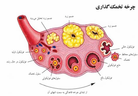 ۵) قشر تخمدان: حاوی فولیکولهای تخمدانی و ماده زمینهای در بین آنهاست. هر فولیکول از خارج به داخل به ترتیب شامل سلولهای کومولوس اووفوروس، سلولهای گرانولوزا، بخش تاج شعاعی (کورورنا رادیاتا)، لایه شفاف (زونا پلاسیدا)، لایه «تکا»، حفره (آنتروم) فولیکول، مایع فولیکولی و بالاخره تخمک ابتدایی است. همچنین درون تخمدان جسم زرد (کورپوس لوتئوم) وجود دارد که پس از تخمکگذاری از باقیمانده سلوهای فولیکولی تشکیل میشود و هورمونهای جنسی زنانه را تولید میکند.