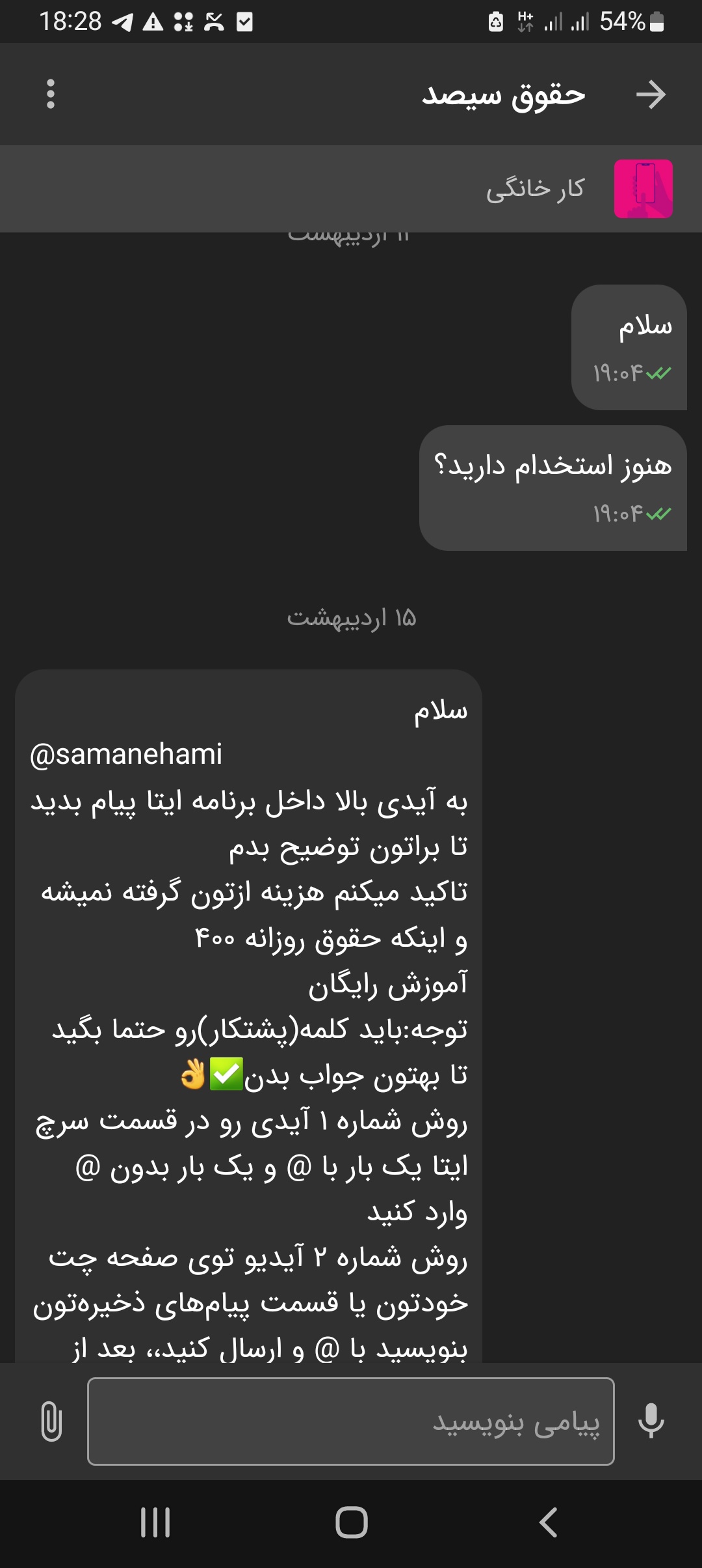 یه خانمی هست داخل سایت دیوار آگهی کار خانگی زده هدایت میکنه ایتا میگه کارمون اینطوریه که برای کارفرما دیوار آگهی میکنیم هر روز و احتیاج به ۱۰۰ نفر نیرو میخوایم میرید سایت دیوار آگهی کار بسته بندی رو برای شهرهای مختلف میزنید و هزینه ثبت آگهی رو از جیب میدین و بعدش جوابگوی ملت میشین بعد ۸ ساعت کار پول ثبت آگهی و ۸ ساعت کار رو میدم ولی بعدش فلنگ ر‌و میبنده و جواب نمیده از اونور ملت بدبخت از طریق آگهی میان روبیکا ۱۶۰ تومن هزینه اولیه کار بسته بندی میدن و بازم طرف جواب نمیده