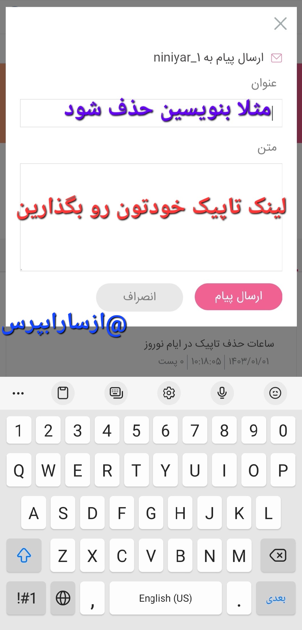 اول لینک تاپیکتون رو کپی کنین بعد خصوصی برای niniyar_1 بفرستین: