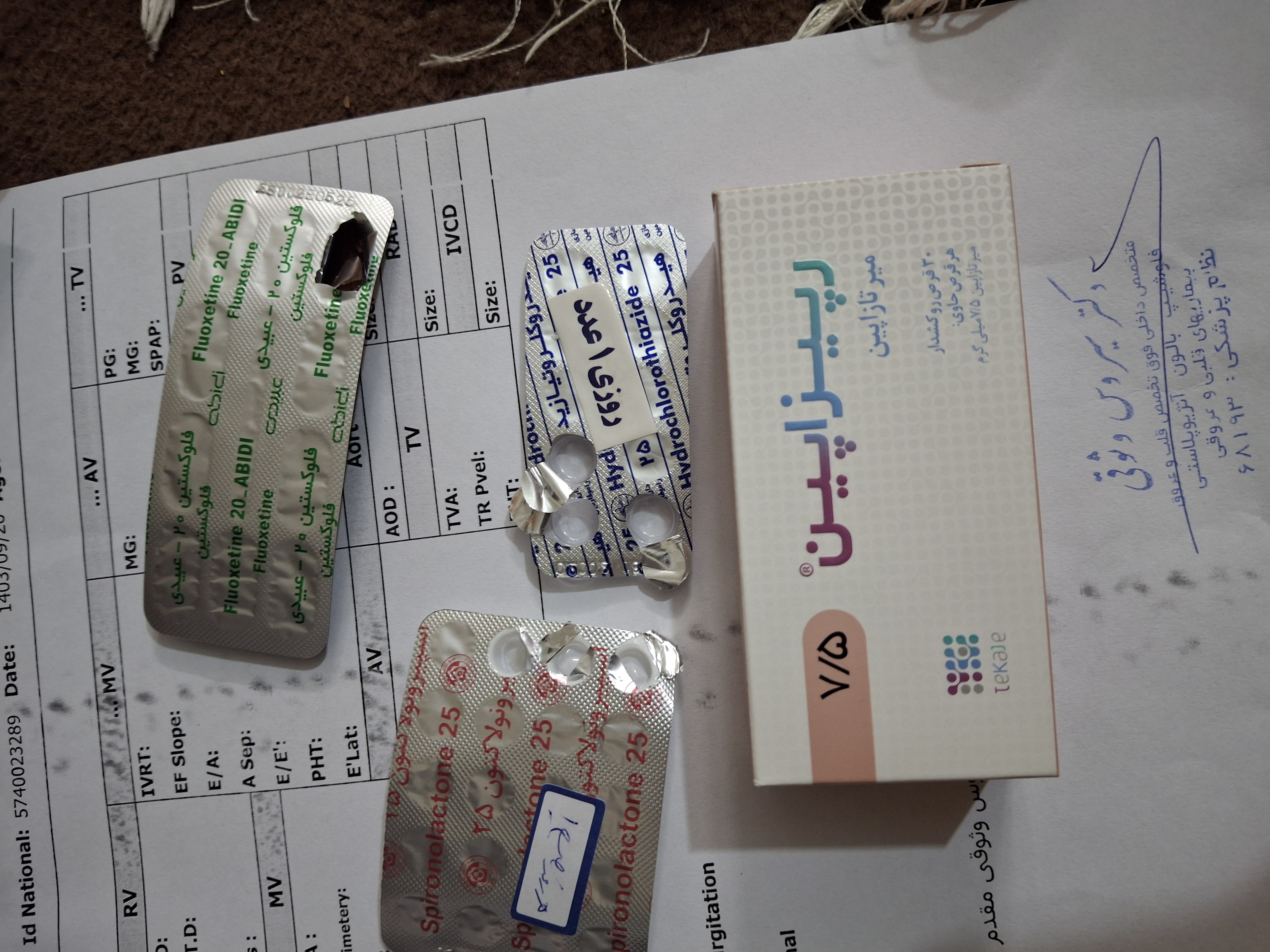 الییییی۷۱ مدیر استارتر عضویت: 1400/09/27 تعداد پست: 410 فلوکستین ضد افسردگیه اسپیرنولاکتون و هیدروکلروتیازید ادرار اوره احتمالا به خاطر ورم پاها تجویز شده ا ...