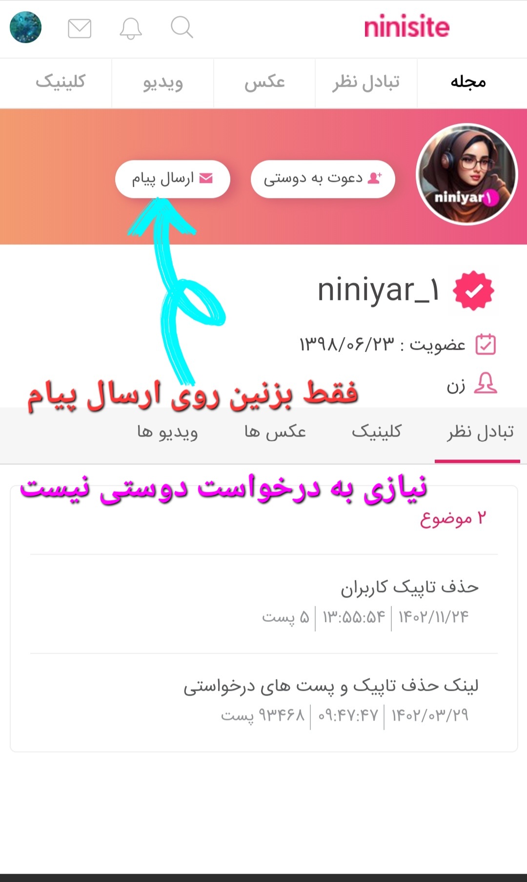 (مثلا جایی پست گذاشتین هم می تونین بزنین رو پروفایلتون ⬅️ هر تاپیکی که می خواهید حذف بشه دستتون رو رویش نگه دارین بعد کپی نشانی پیوند )