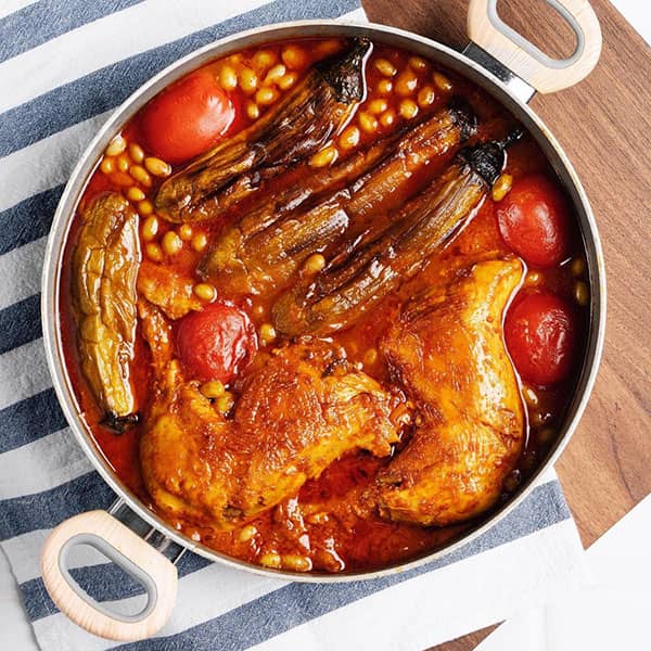 بادمحون کباب کن گوجه هم دوس داشتی کبابش کن سیر رو خرد کن با پیاز بزن تنگش با تخم مرغ یه میرزا بذار میتونی مرغ بادمحون بذار من دارم برا شام میدارم با بزنج