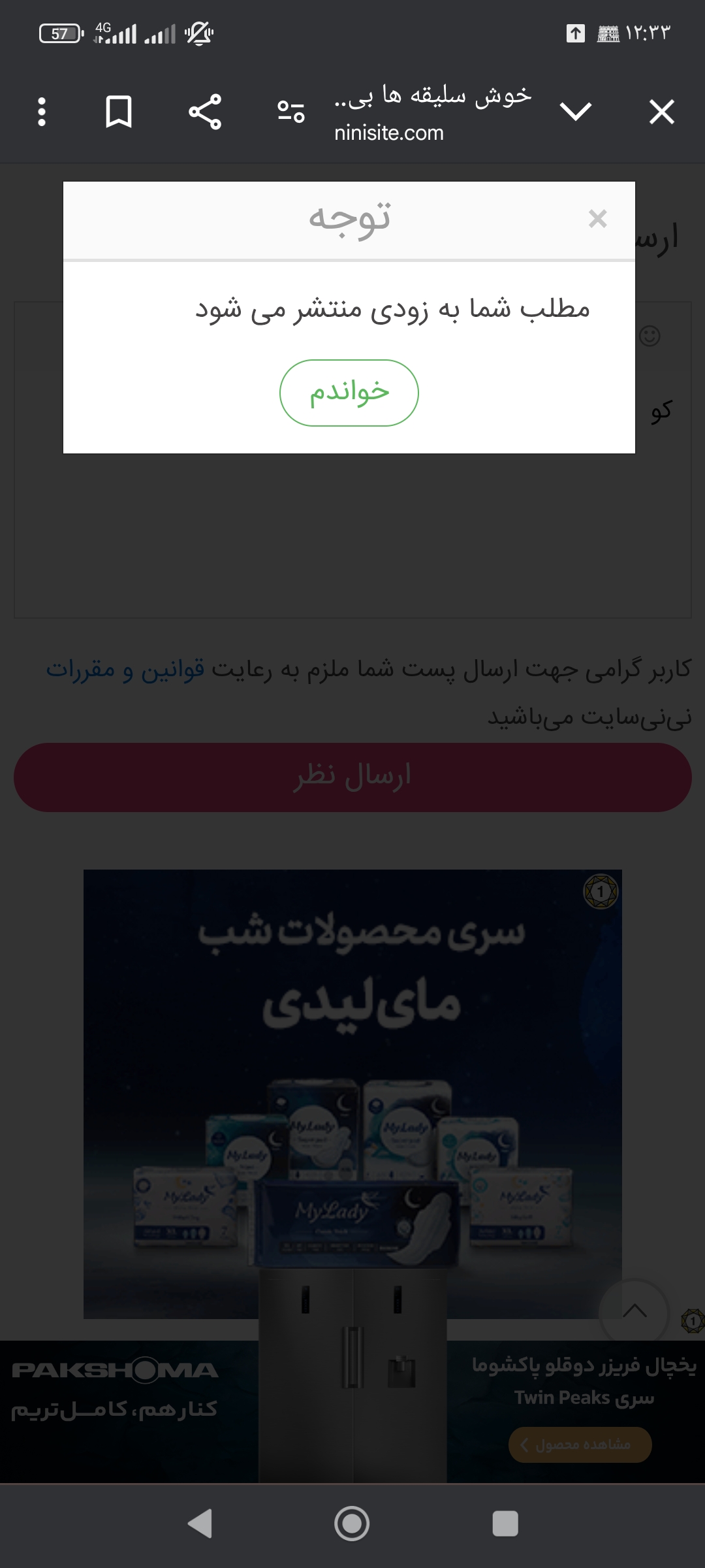"به علت پایش محتوا، محتوای درج شده توسط شما با کمی تاخیر منتشر میشه.بنابراین نگران انتشار محتوای خود نباشین..."