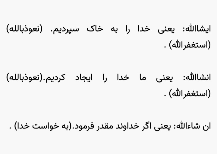 نیکااام عضویت: 1403/12/01 تعداد پست: 3252 یعنی شما بخوای به یکی بگی انشاءالله حالت خوب باشه میگی ایزد خواست که حالت خوب باشه؟یکم سخت نیس؟ پارسیش اینه!
