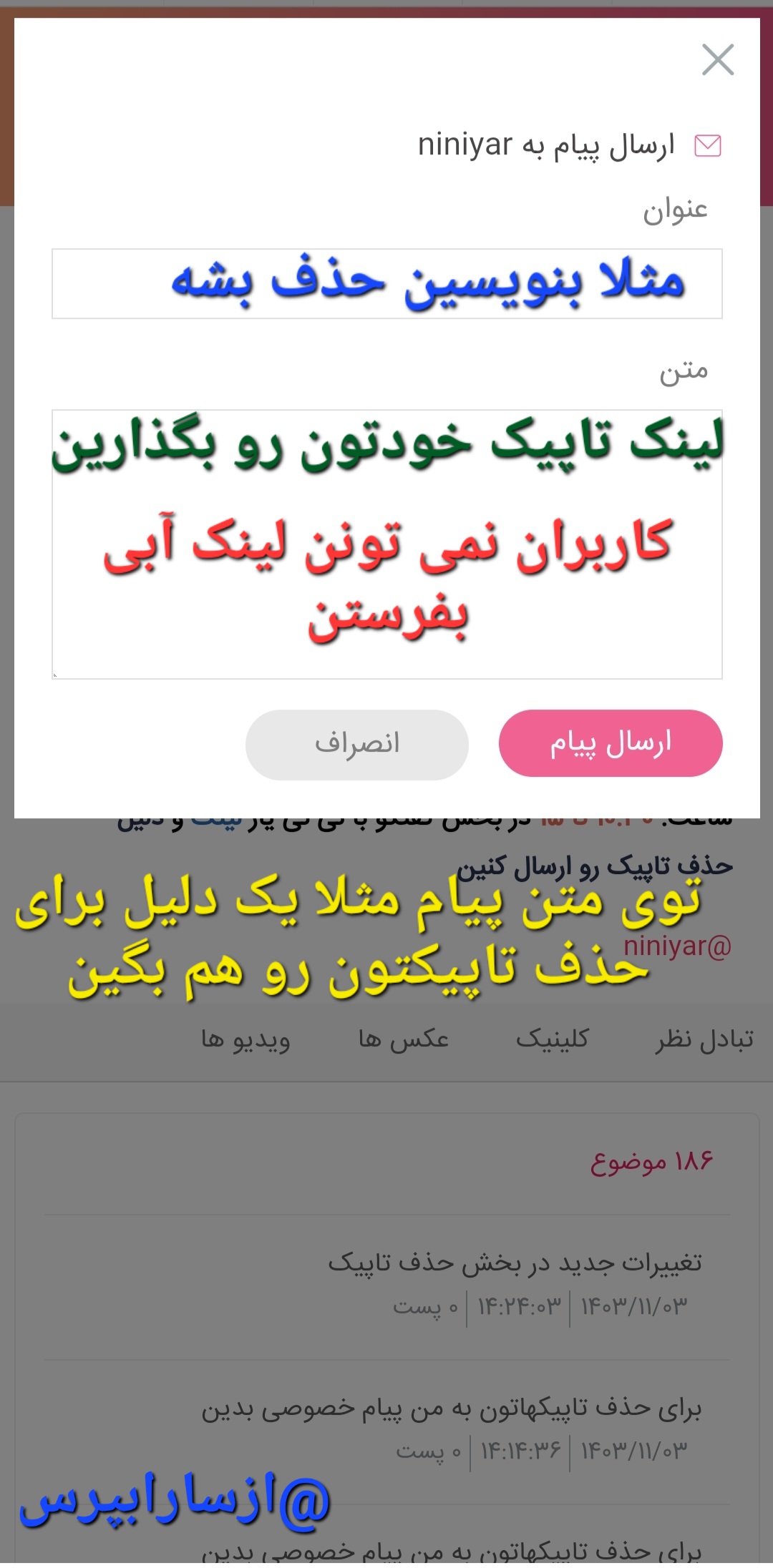 (مثلا جایی پست گذاشتین هم می تونین بزنین رو پروفایلتون ⬅️ هر تاپیکی که می خواهید حذف بشه دستتون رو رویش نگه دارین بعد کپی نشانی پیوند )