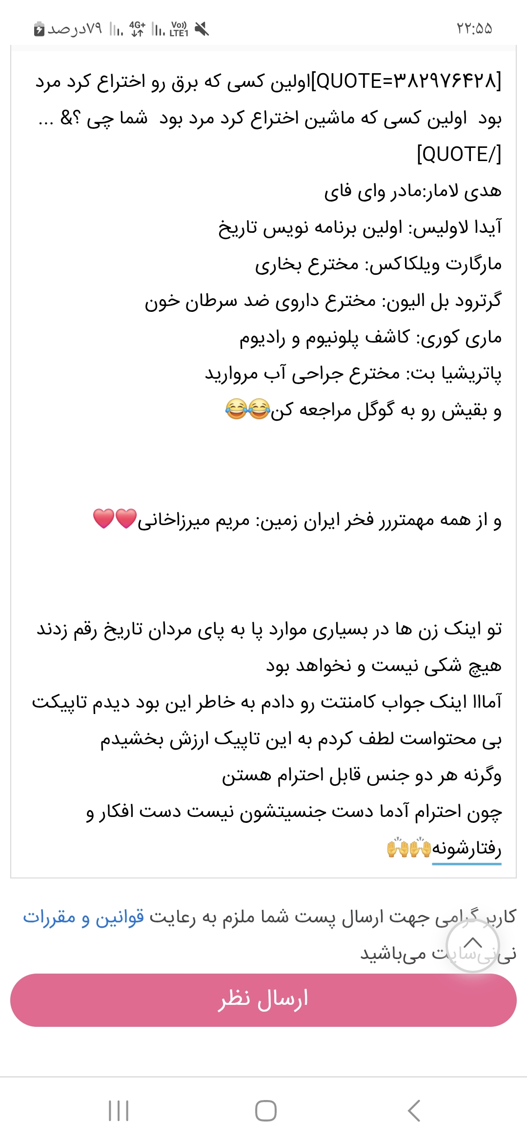 تو اینک زن ها در عرصه های علم پا به پای مردان تاریخ رو رقم زدند هیچ شکی نیست