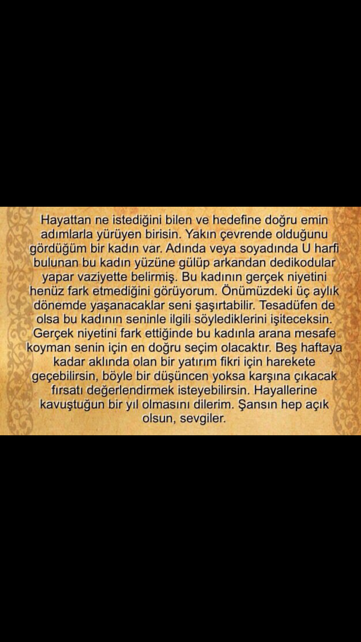 در زندگی انسانی هستی هدفمند و با اراده...زنی در اطراف و آشنایانت هست که اول اسم یا فامیلش با حرف u شروع میشه.این زن به روی تو میخنده ولی پشت سرت نقشه های بدی برات داره ولی هنوز هدف خاصی از این نقشه ها نداره...تا سه ماه آینده اتفاق های جالبی برات میافته شاید از طریق دوستی متوجه نقشه های اون زن بشی....