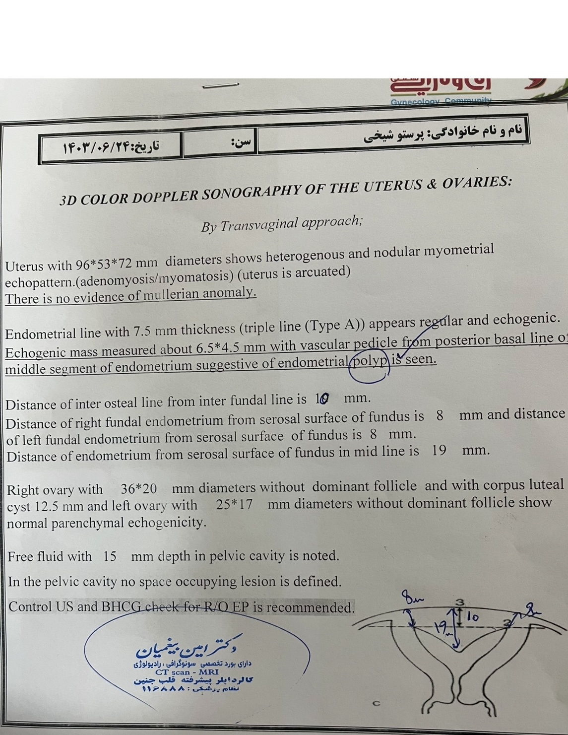 توده اکوژن به اندازه حدودی 6.5×4.5 میلیمتر با پایه عروقی (vascular pedicle) از بخش خلفی پایهای آندومتر در بخش میانی آن دیده شده که مشکوک به پولیپ آندومتر است.