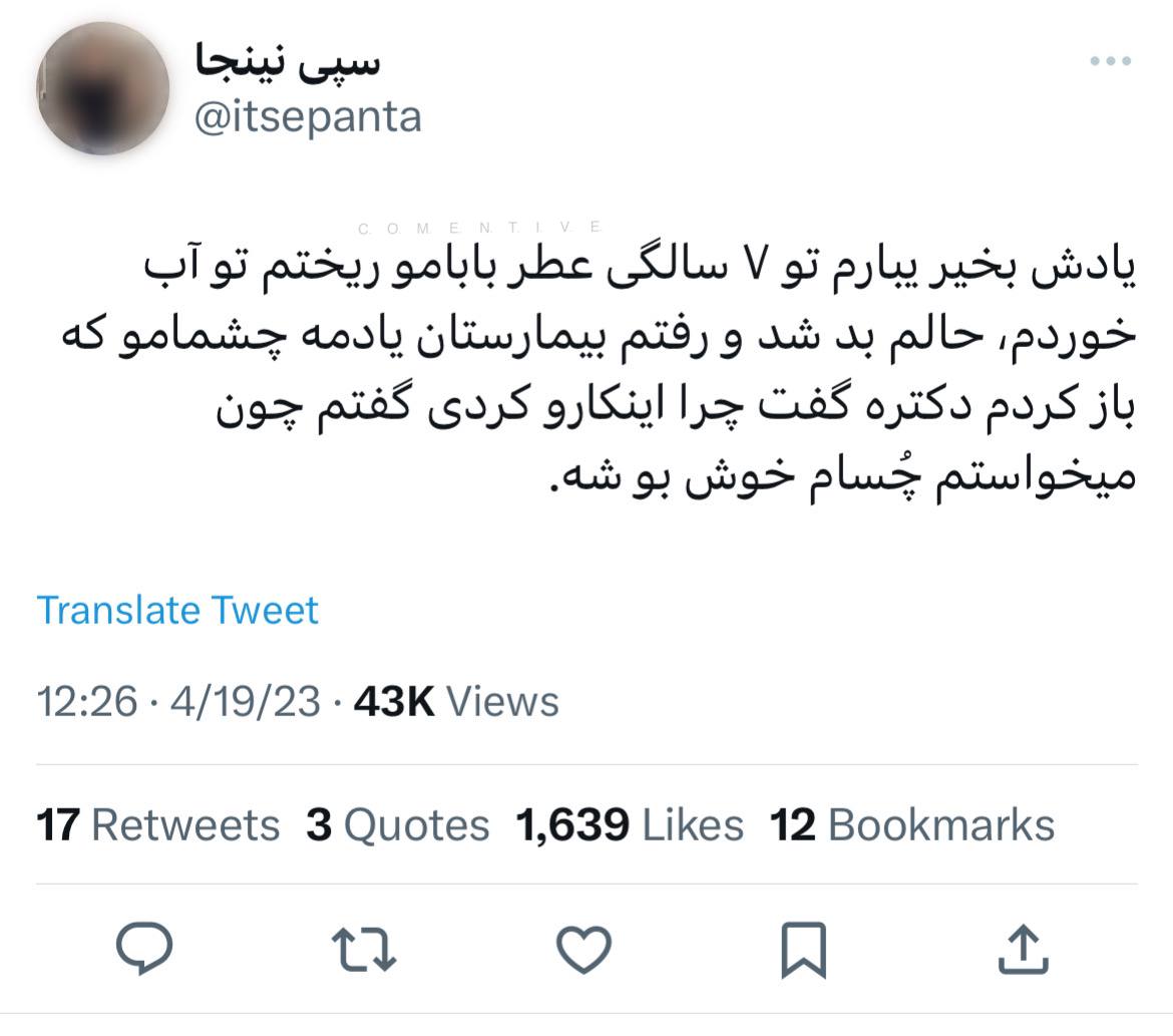 یادش بخیر یبارم تو ۷ سالگی عطر بابامو ریختم تو آب خوردم حالم بد شد و رفتم بیمارستان یادمه چشمامو که باز کردم دکتره گفت چرا اینکارو کردی گفتم چون میخواستم چسام خوش بو شه