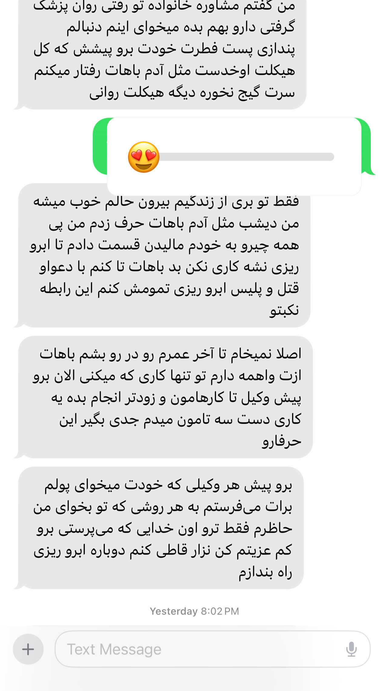 همسر من چنین پیام هایی به من بده به بزرگی خدا قسم حتی اگر بعد ازدواج با پسرم اواره کوچه و خیابون بشم میرم سراغ وکیل و کارهای طلاق