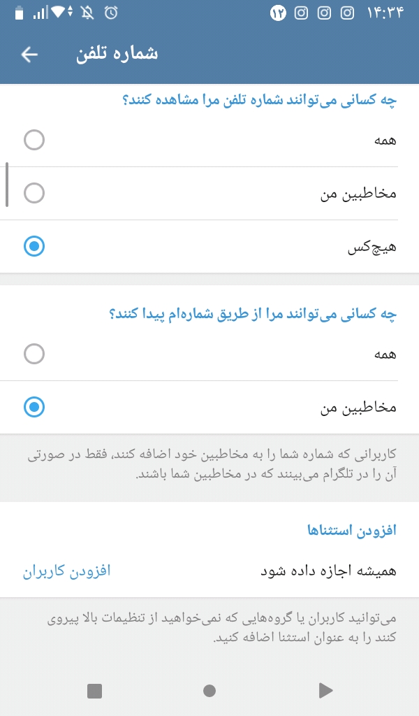 من تنظیمات رو گذاشتم رو اینکه شمارمو فقط مخاطبینم پیدا کنن و اینا .