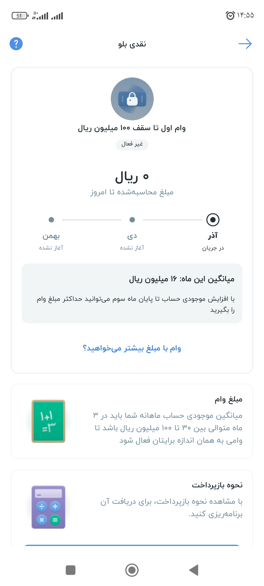 خب بار اول تا ده میلیون وام میده.بیشتر وام نمیده فک کنم.حداقل موجودی کارتت تا سه ماه هرروز ده میلیون ...