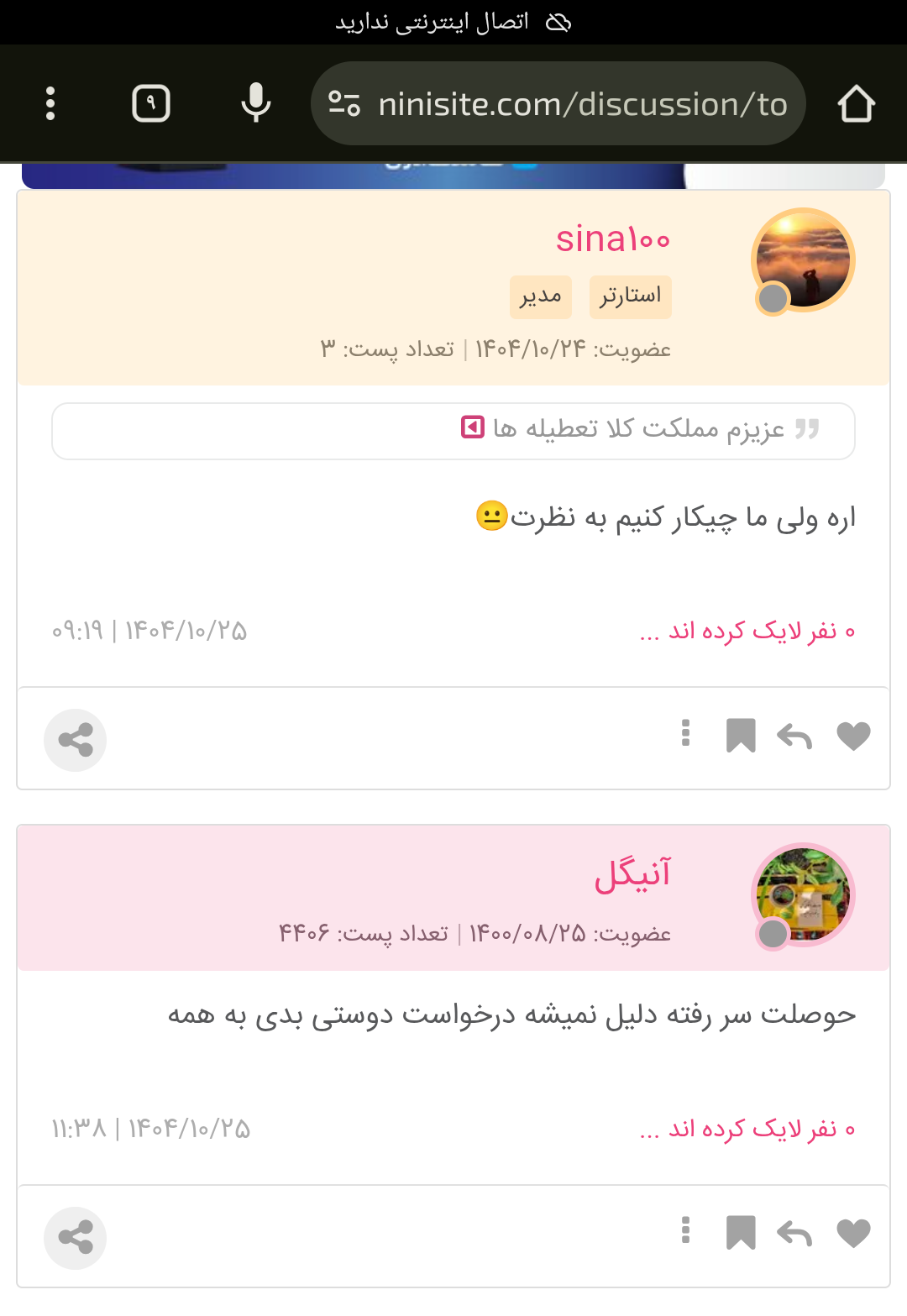 یارملک مدیر استارتر عضویت: 1404/06/28 تعداد پست: 281 عنوان یک نفس بکش حداقل 409 بازدید | 0 پست @sina100 کاری داشتی میخوای یک استراحت به خودت بده بعد درخواست دوستی به بقیه بده بعد هم شماره کارت میدم اول ۱۰۰ بزن بعد ببینم چی میگی 1404/10/25 | 15:41 8 نفر لایک کرده اند ... گزارش تاپیک نامناسب