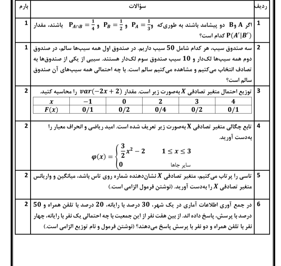 • صندوق ۱: همه سالم → (P(\text{سالم}|\text{صندوق ۱})=1)