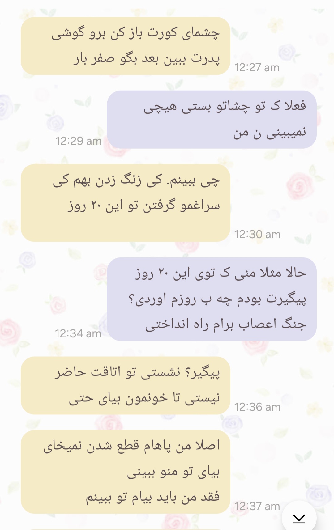 🫠دیشب گفت منتظر بودن خانوادت تا یکی بگیرتت بدبخت حتی گردنت هم نمیگیرن اینقدر بهم برخورده اینقدر بهم برخورده ها حدددد نداره