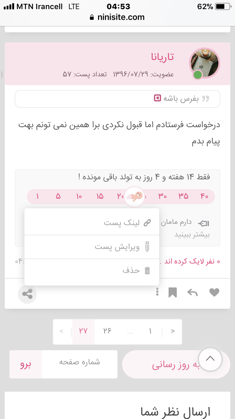 تاريانا عضویت: 1396/07/29 تعداد پست: 857 چجوری عکسی ک میفرسین پاک میکنین اين سه تا نقطه رو كه بزنى گذينه حذف مى ياد خدایا شکرت