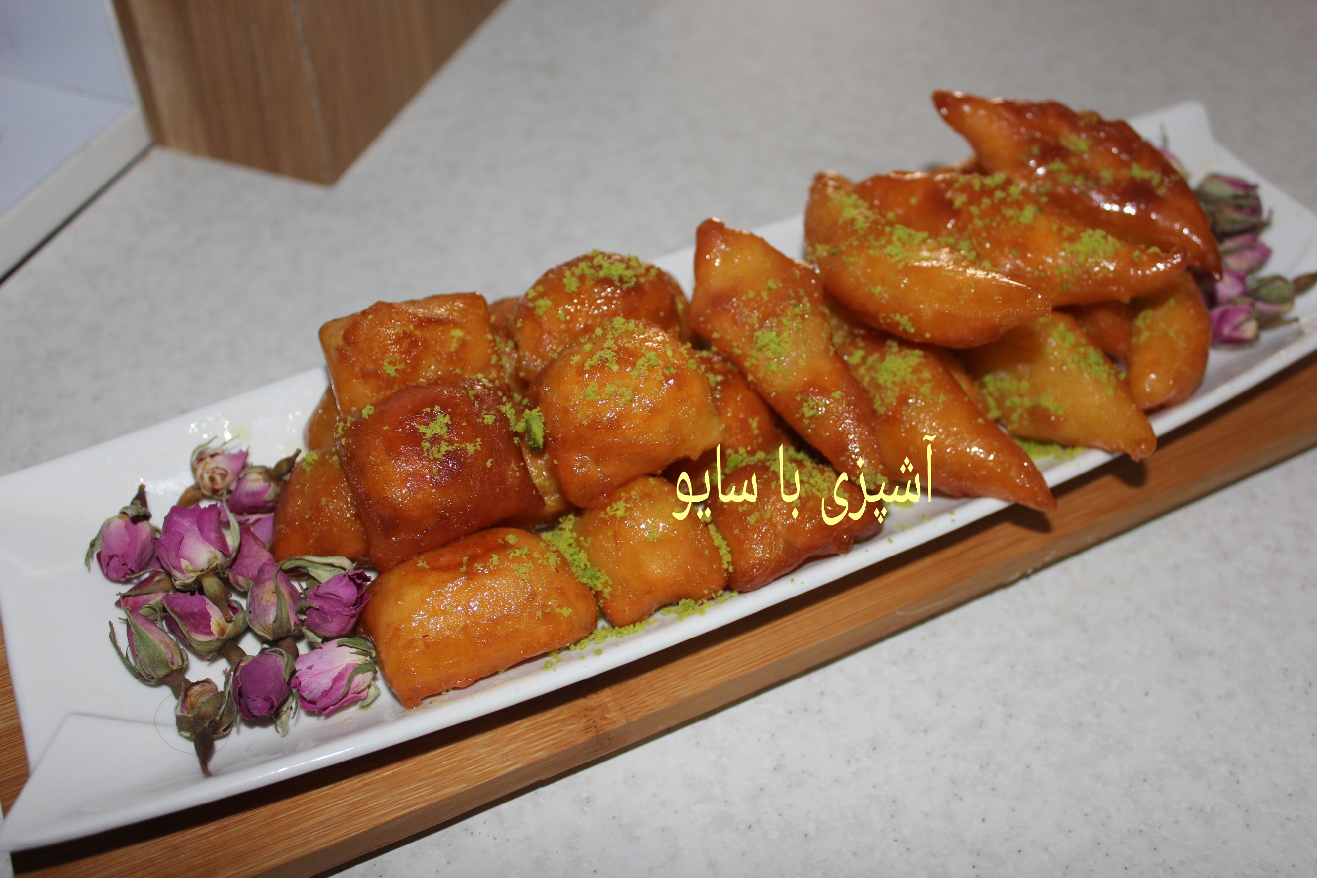 بعد همونجور داغ داغ بندازید توی شربت سه دقیقه بمونه بعد توی صافی بزارید که شهد اضافش خارج بشه برای تزیین یکم پودر پسته بریزید که خوشرنگ بشن