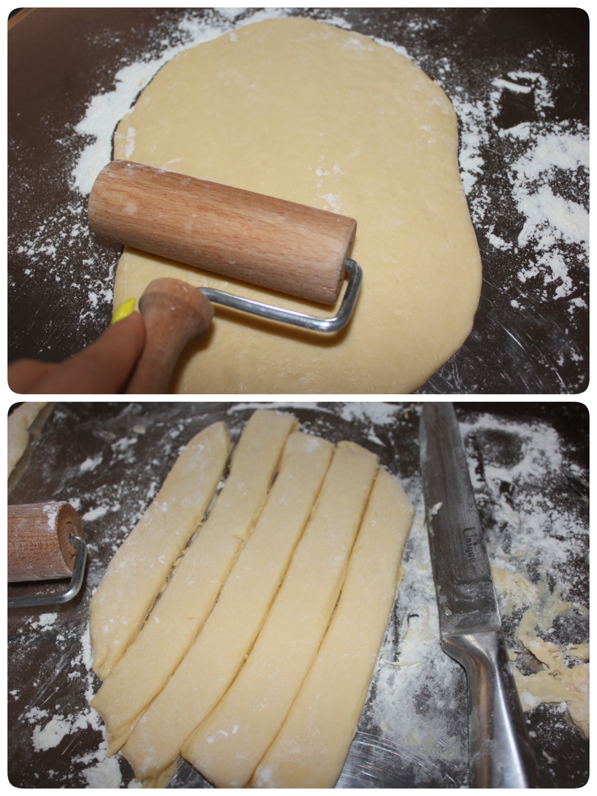 بعد سطح کارتون رو خیلی کم ارد پاشی کنید خمیر رو با وردنه باز کنید به قطر نیم سانت بعد طبق عکس مستطیل های بلند برش بدید بعد برش های کج کج بزنید تا لوزی درست بشه یا مربع های کوچیک برش بزنید