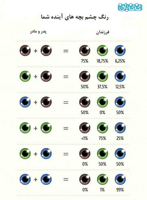 رنگ چشم تیره غالبه نسبت به رنگ روشن. البته اگه شما هم در یکی دو نسل قبل والدین چشم‌رنگی داشته باشین احتمال اینکه چشم بچه هم روشن باشه وجود داره.