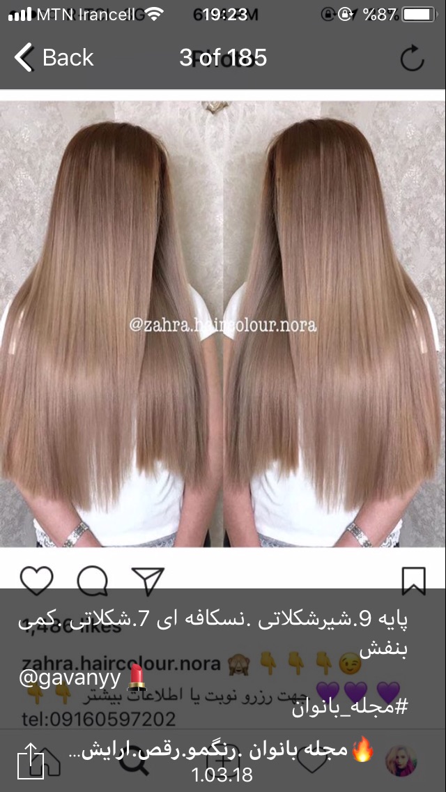 _lady__ عضویت: 1396/10/09 تعداد پست: 9277 ممنون دوستم اینم عالیه.اینا چطور موهاشون اینقدر براقه😯😯 رنگهاشون خوبه کراتین داره توش ،بعدشم ک سشوار میکشن اینجوری میشه
