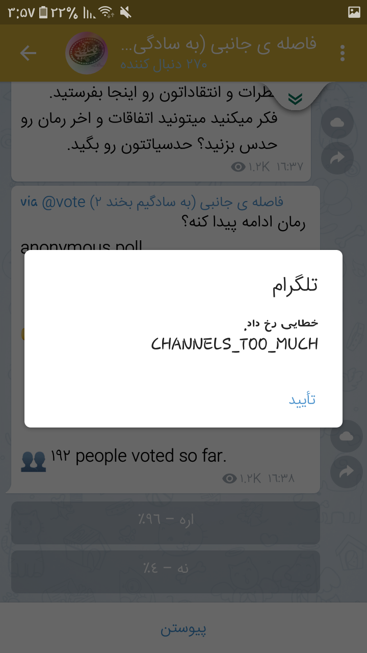 زهرا۱۳۷۷ مدیر استارتر عضویت: 1397/07/08 تعداد پست: 4592 این که میگه کانال ها خیلی زیادن متوجه شدم چی میگه ولی خو الکی میگهمن کلاً۳تا کانال عضوم میخواستیم اینم عضو بشم که میگل زیادن