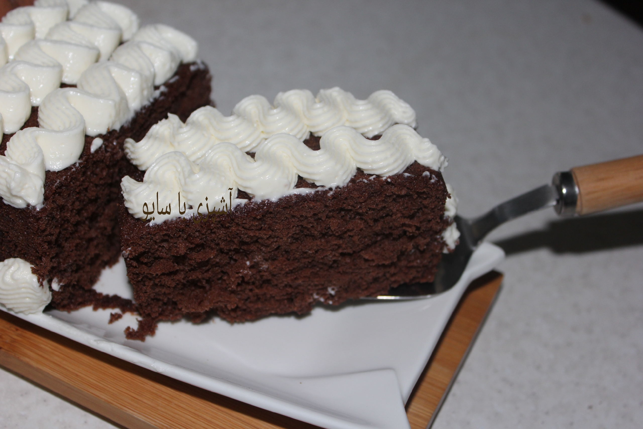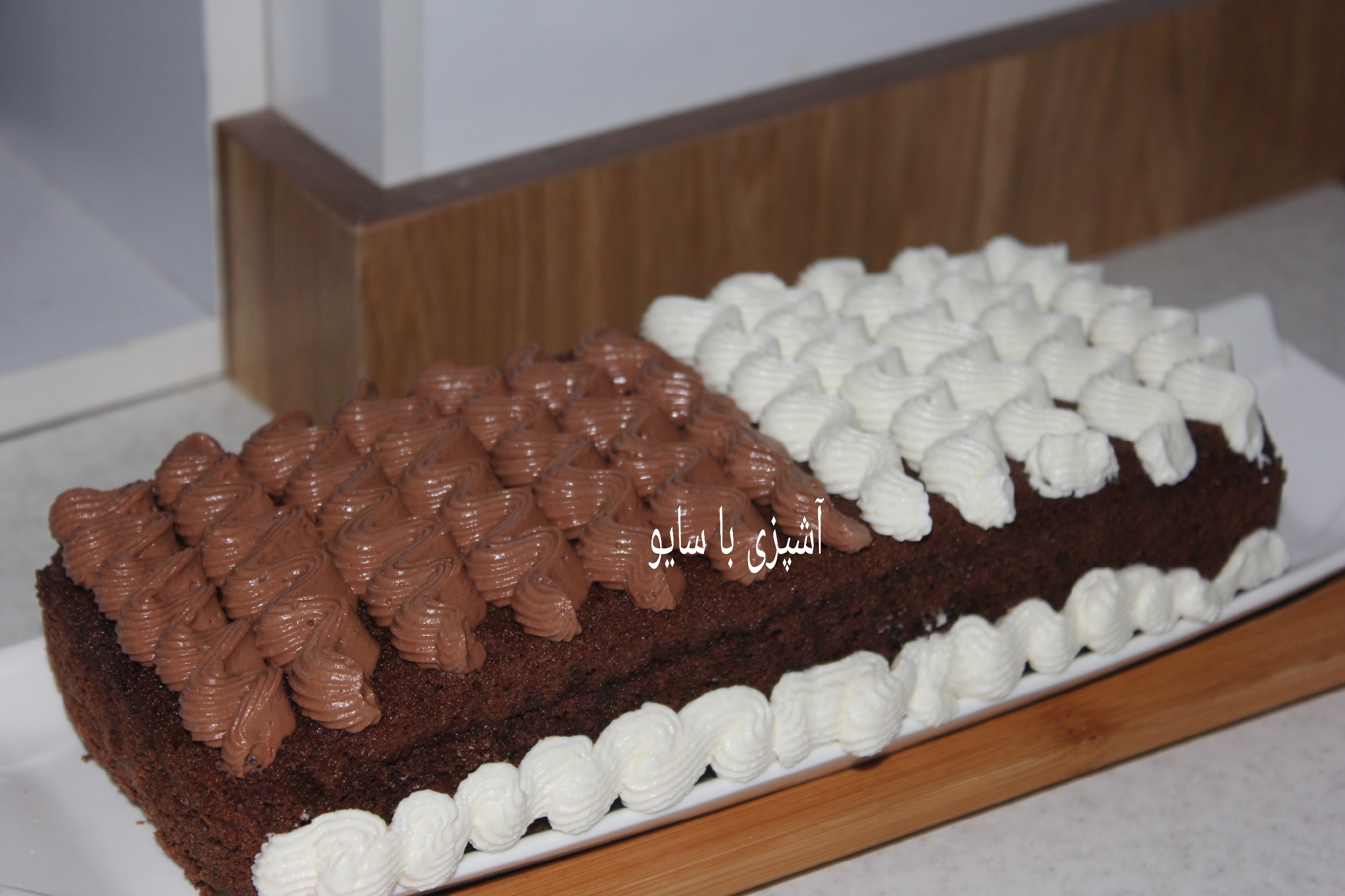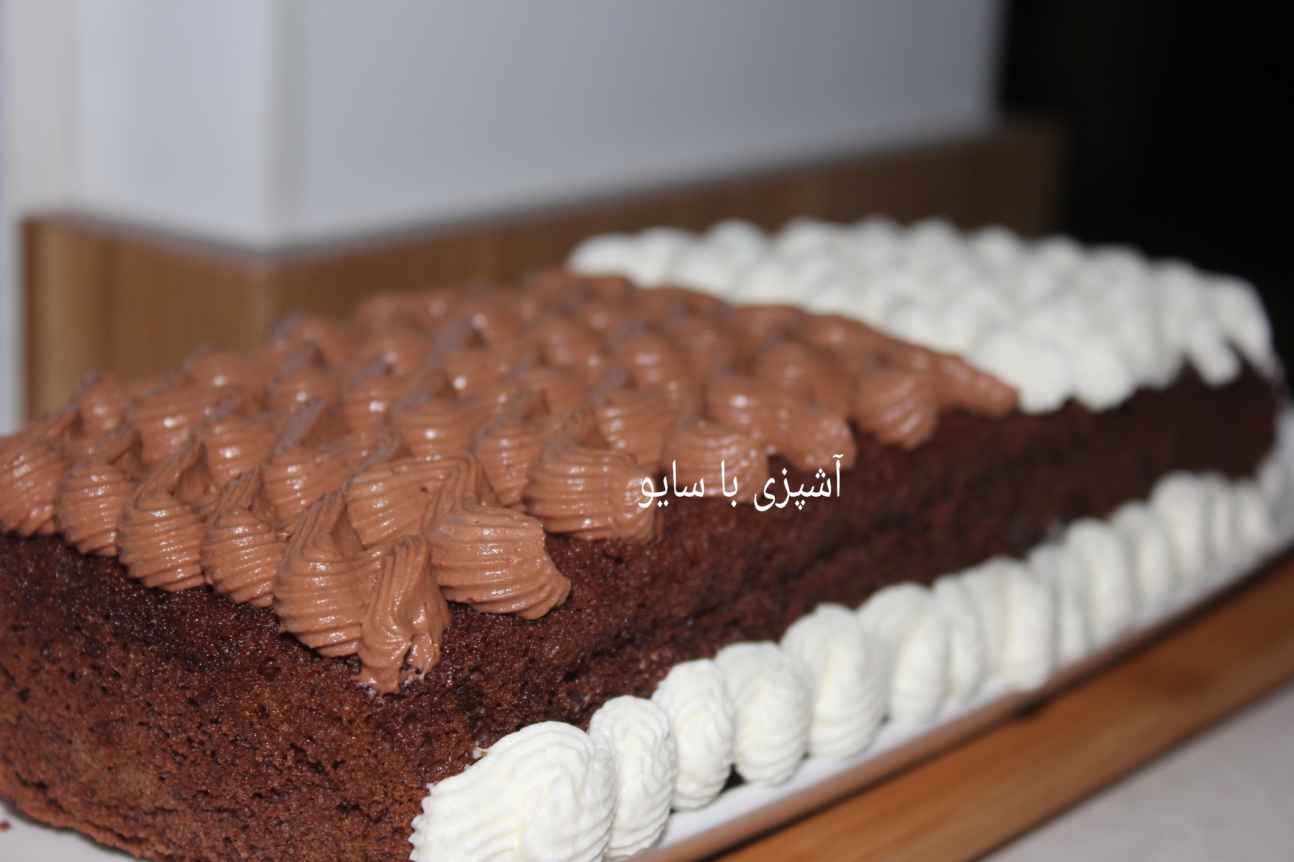 بعد مواد رو دو قسمت کنید به یه قسمتش شکلات آب شده اضافه هم بزنید و با کمک قیف و ماسوره روی کیک طرح بزنید