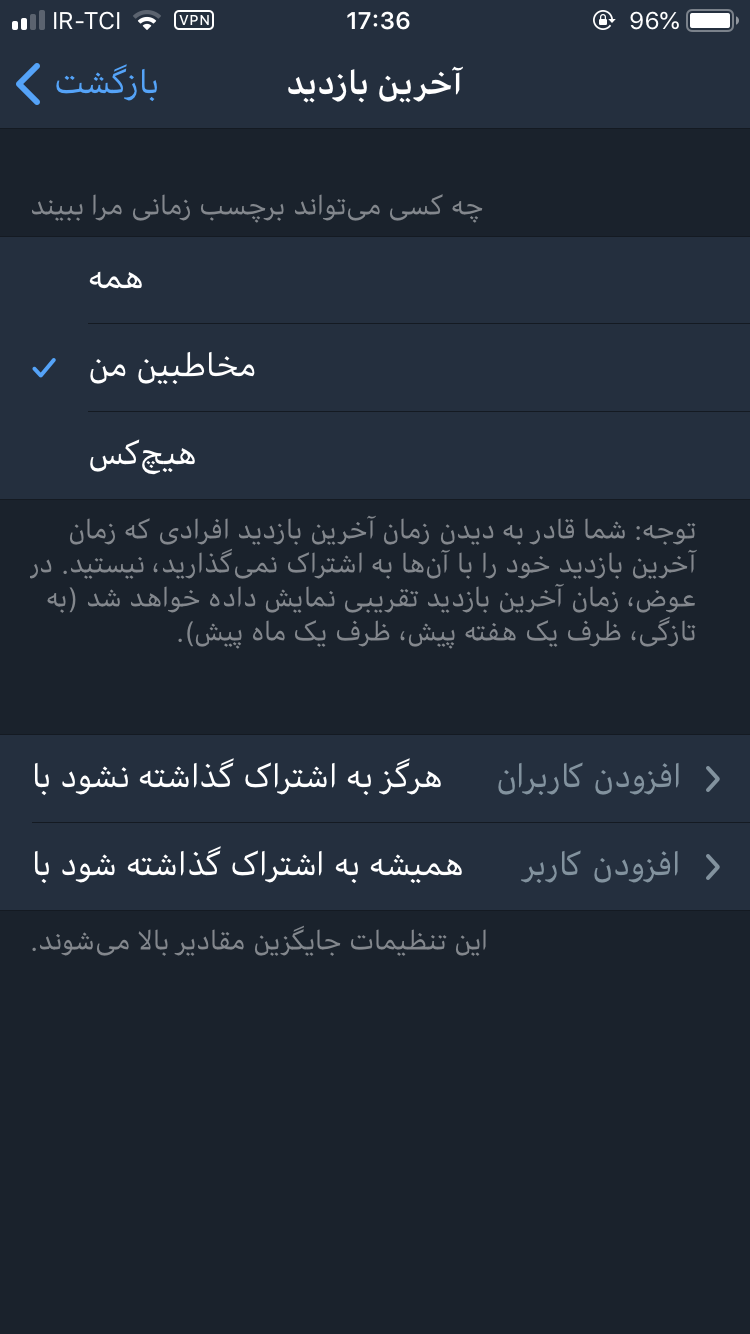 دوستم گوشیش آیفونه یه چیزی گفت میخوام ببینم راست میگه یا نه. میگه تل گرام من(تل گرام اصلی) تو قسمت تنظیمات لست سین ریسنتلی ، این آپشن رو نداره که بشه همه رو لست سین کرد به جز یه نفر!