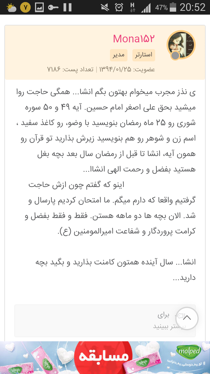 من واسه بچه دار شدن یکی از اشناهامون خیلی دعا کردم و خدا بعد از حدود ده سال اونها رو صاحب فرزند کرد امشب هم تو مراسم احیا مسجد واسه مادر شدن همه دعا میکنم انشاالله که تا سال بعد فرزندتون رو در اغوش بگیرید