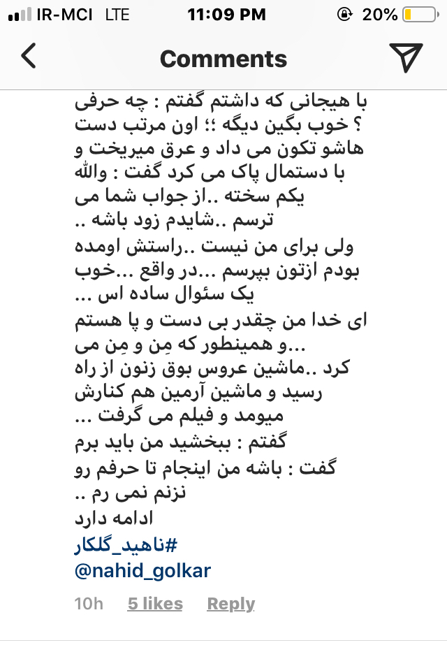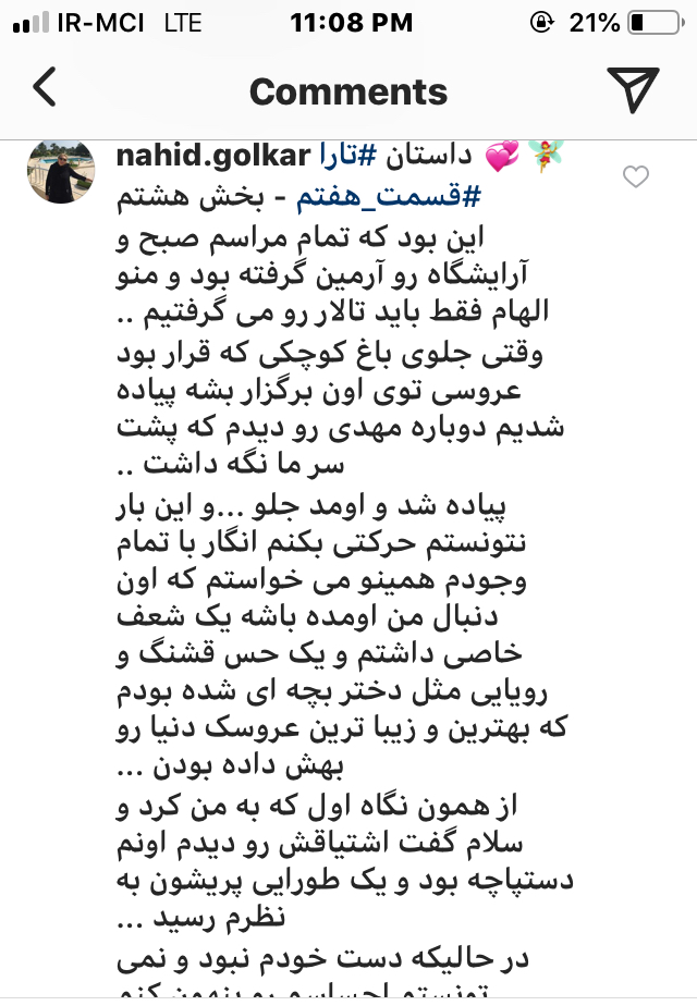 دوستان خوبم سلام شبتون به خیر راستش امروز هرچه تلاش کردم نشد که نشد این وی پی. ان وصل نشد دیگه راهی که موند همین اسکرین از اینستا بود که خیلی زمان بره ولی چاره ای نبود نمیشد داستان رو نصفه کا ره ول کرد فردا هم اگه وی پی ا ن وصل نشد داستان رو همین حدودا میذارم آخر شب بیاین سر بزنید چون باید دونه دونه عکس بگیرم ‌اینجا لود کنم خیلی زمان میبره راستی میتونید بزنید رو عکسها تا نوشته ها واضح تر و بزرگ‌تر بشه انشالله ببرم مغازه برام فیل تر شکن پولی بریزه تا دردسرم کمتر شه شبتون خوش ❤️