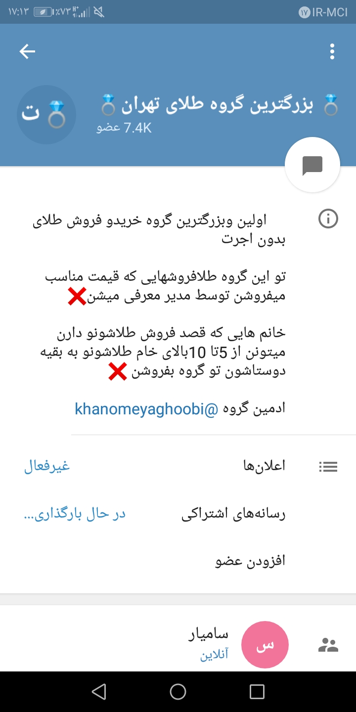 nafasii124 مدیر استارتر عضویت: 1396/08/01 تعداد پست: 2065 یه گروه خیلی بزرگه چند هزار نفری کل تهرانه اگه گسند کردین هر طلا فروشیه مورد اعتماد قرار میزاری اونج ... ادرسشو میدید حس اون بچه ای رو دارم که فقط به خاطر اینکه صاحب توپه بازیش میدن...