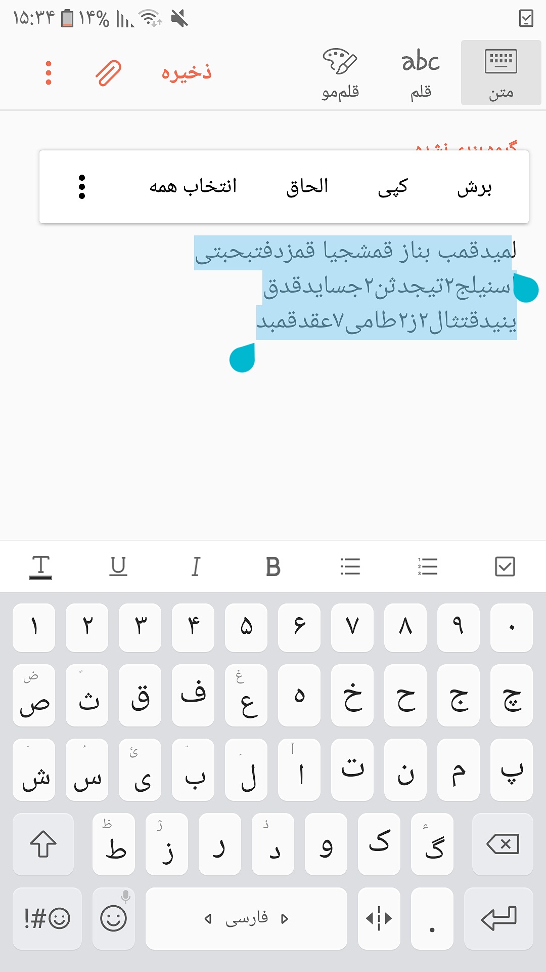اینو ببین رو اولین کلمه ای ک تایپ کردی یه چن دیقه انگشتتو نگه دار یه کادر آبی میوفته روش خوب ؟ تا پایین نوشته هات بکشش بد از گزینه ها کپی رو انتخاب کن درست میشه❤