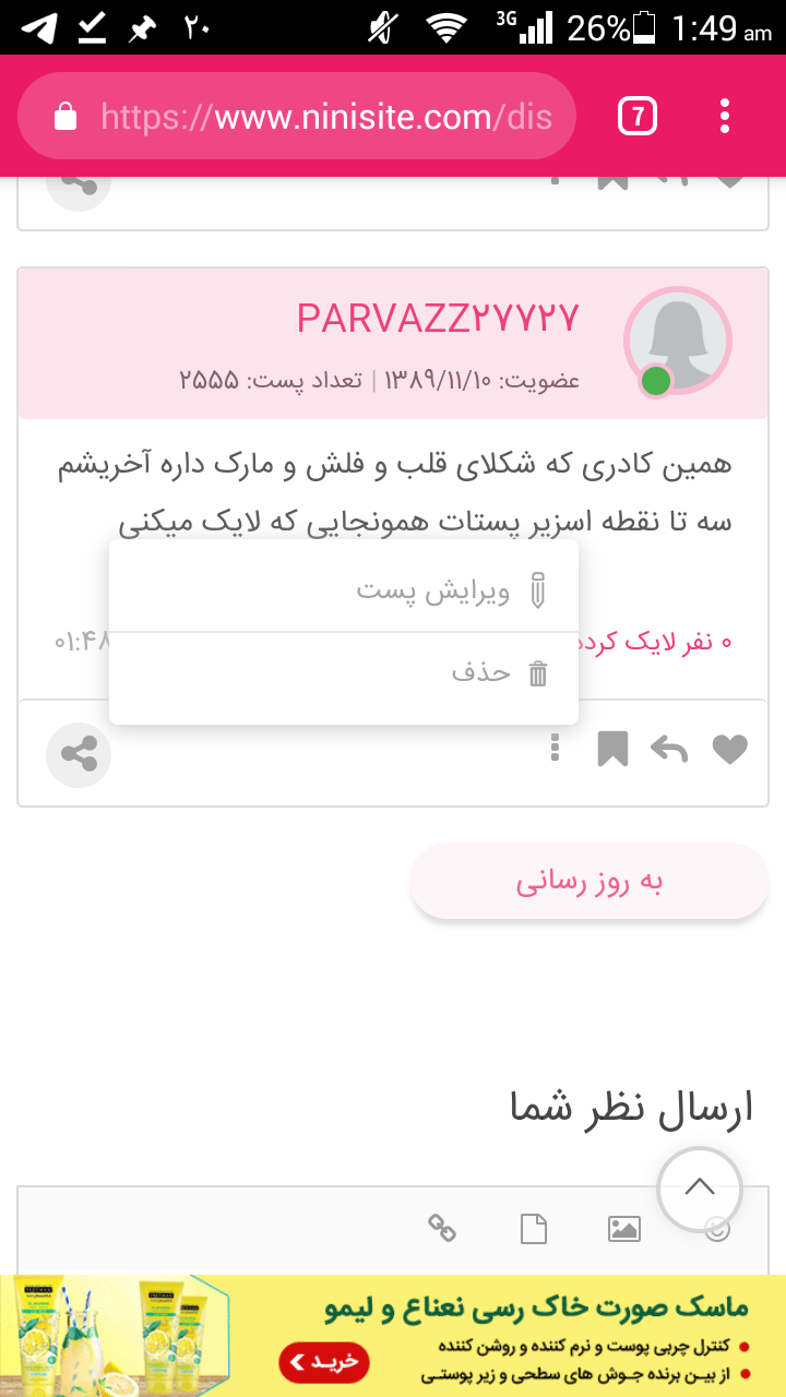 PARVAZZ27727 عضویت: 1389/11/10 تعداد پست: 5240 پایین پستایی که میذاری توی کادر پایین روی اون سه تا نقطه عمودی بزنی گزینه ویرایش و حذف هم داره البته