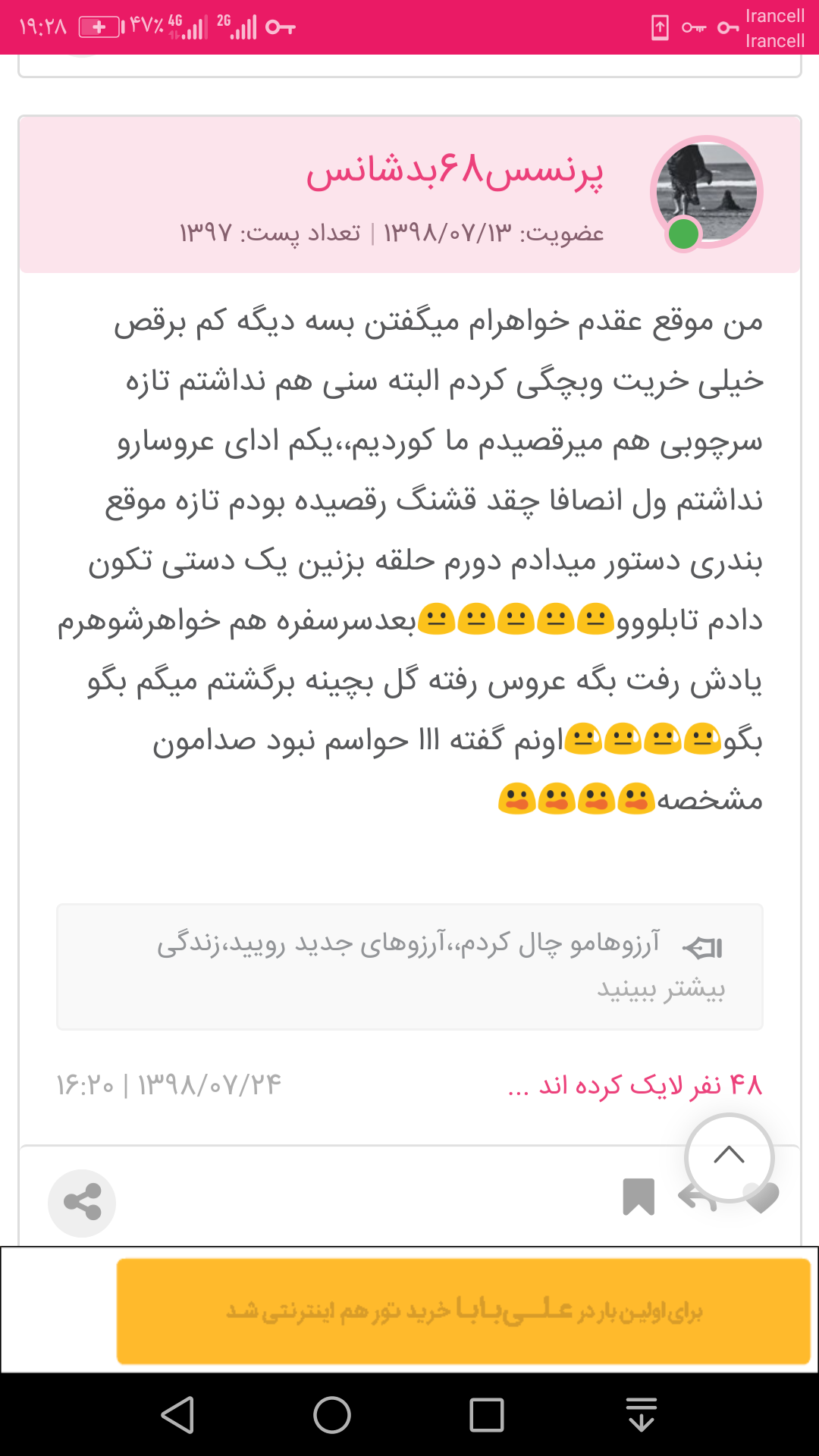 پرنسس68بدشانس عضویت: 1398/07/13 تعداد پست: 11219 هر چی دوست داری اگه دوست داری بگو خو حوصله ندارم والی کل عمر من سوتیه😐بزار از تاپیک قبل شات بدم ک سوتی دادم موقع عقد باید از سمت خدا معجزه نازل بشود که دلم❤️🩹بازدلم❤️🩹بازدلم❤️🩹دل♥️بشود🥲