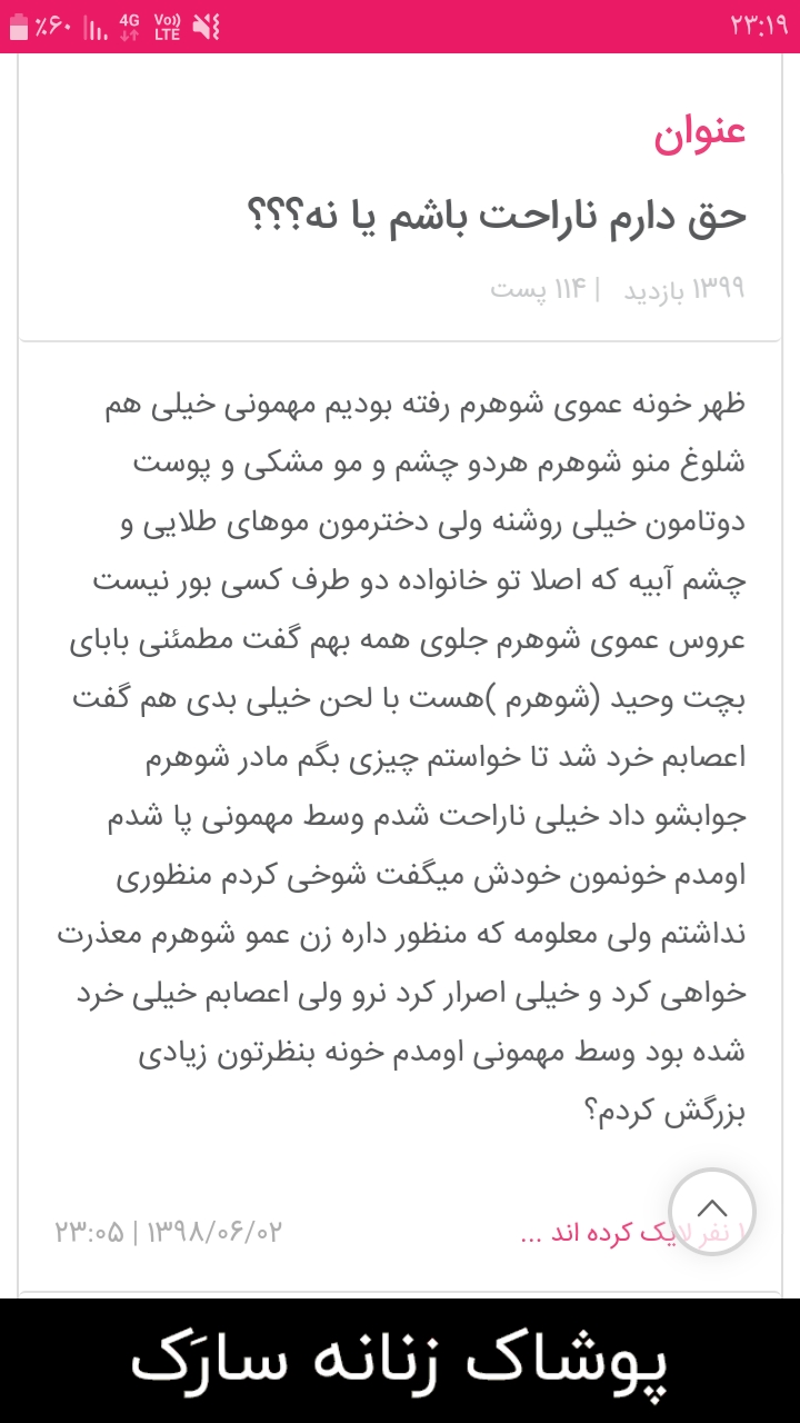 ناراحتیم برای اینه که آون وقت که خیانت میکرد بهش میگفتم دوبار کتکم زد بهم گفت دوستت ندارم و گمشو از زندگیم