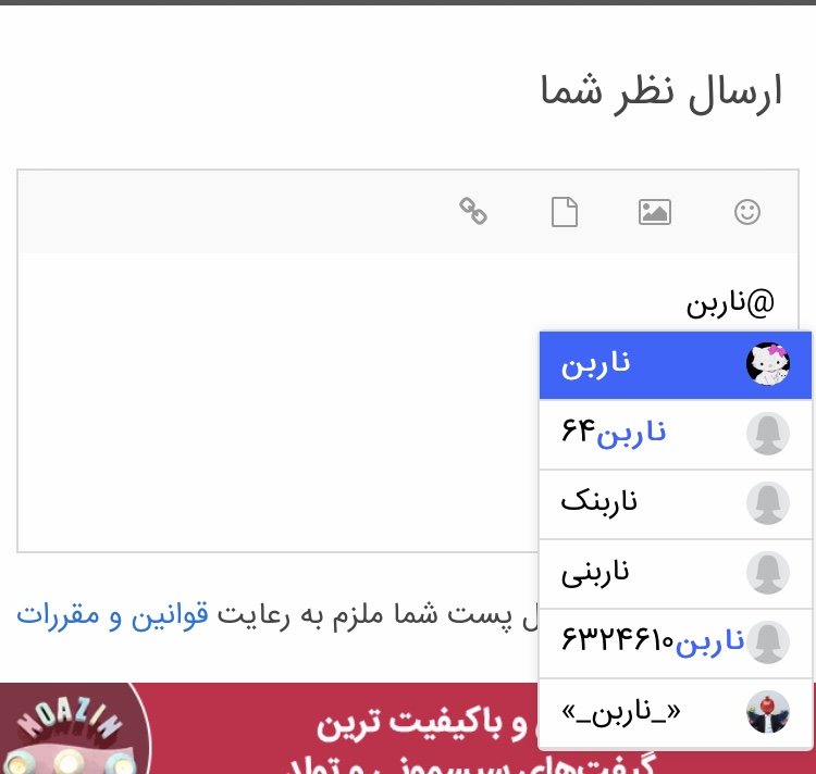 رنـــــزمه عضویت: 1398/10/25 تعداد پست: 872 عزیزم وقتی نوشتی یک بار با انگشت روی کلمه آخر بزن اسمش میاد روی اون بزن آبی میشه