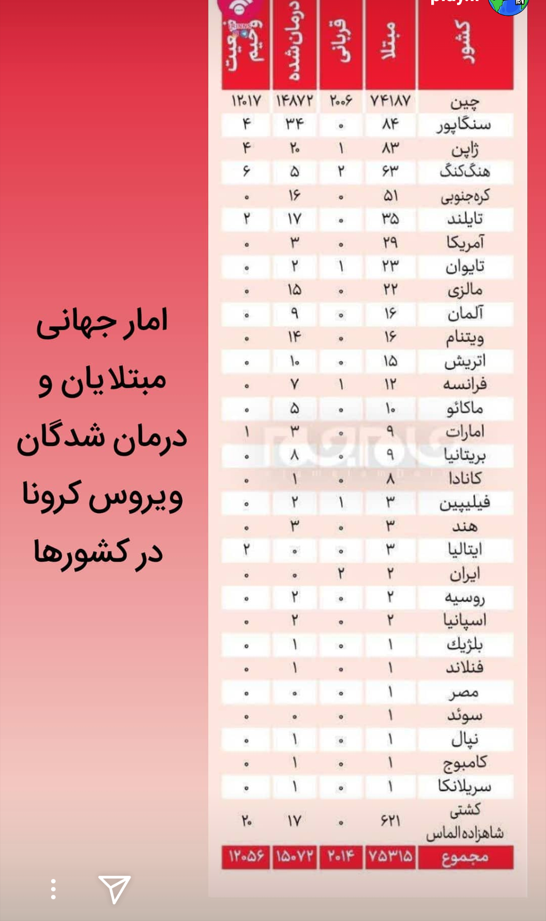 خدابخیربگذره هی داره آمارکروناگرفته هاتوایران بیشترمیشه اون چینیانشستن خفاش ومارخوردن ماچرابایدپاسوز ...