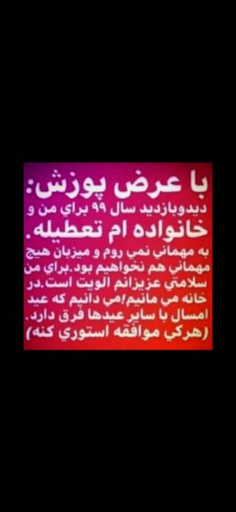 توروخدا یه متنی یه چیزی بگید بزارم استوری. خواهرشوهرم اینا ٢۴ ساعته درحال گشتن و اینان قراره تواین یکی دوروز بیان خونمون. خودمم یک ماهه قرنطینه ام .این درسته که من یکماه قرنطینه باشم بعد ازاونا بگیرم؟ شوهرم غیر مستقیم بهشون گفت ولی کوتا بفهمن😭😭